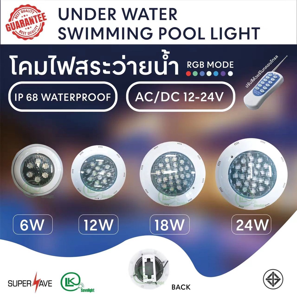 โคมไฟสระว่ายน้ำ Swimming pool light 12w18w 24Wมีทั้งแสง เดย์ไลท์และวอร์มไวท์ และ RGBมีรีโมทแถมให้ ลดค่าไฟฟ้ามากกว่าหลอดทั่วไปถึง2-3เท่า วมร้อนต่ำ ไมมีรังสี UV มีอายุการใช้งานถึง 30,000-50,000 ชั่วโมง เพิ่มความสวยงามของสระว่ายน้ำในยามค่ำคืน