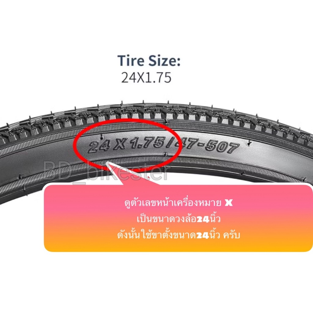 เช่น 24x1.75 จะเป็นวงล้อ24นิ้ว ใช้ขาตั้ง 24 นิ้ว ถ้าเป็นตัวเลข 26 x1.75 จะเป็นวงล้อ26นิ้ว ใช้ขาตั้ง 26 นิ้ว