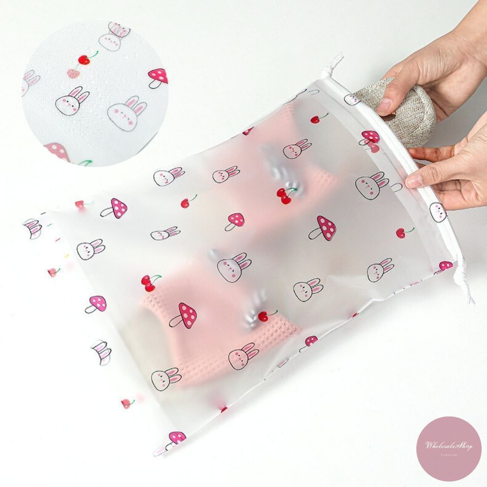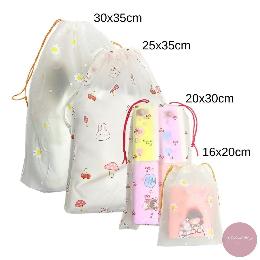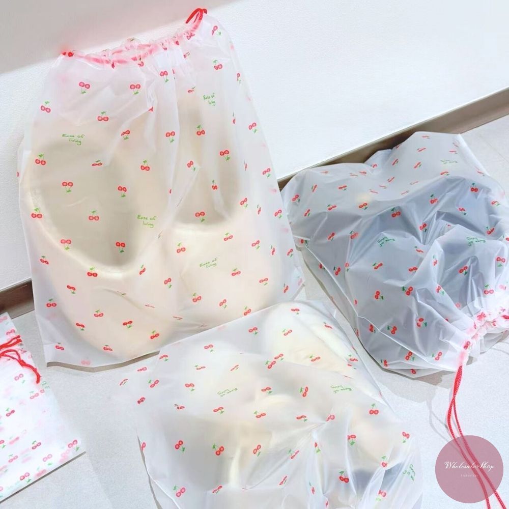 ถุงหูรูดพลาสติก มีสายหูหิ้ว ใส่รองเท้า ใส่ของอเนกประสงค์ หลากหลายไซส์ ลายเชอร์รี่ / เดซี่ / กระต่ายเห็ด เลือกลายได้