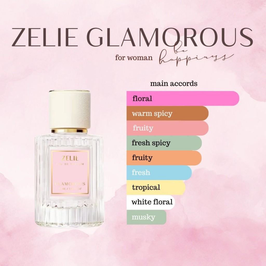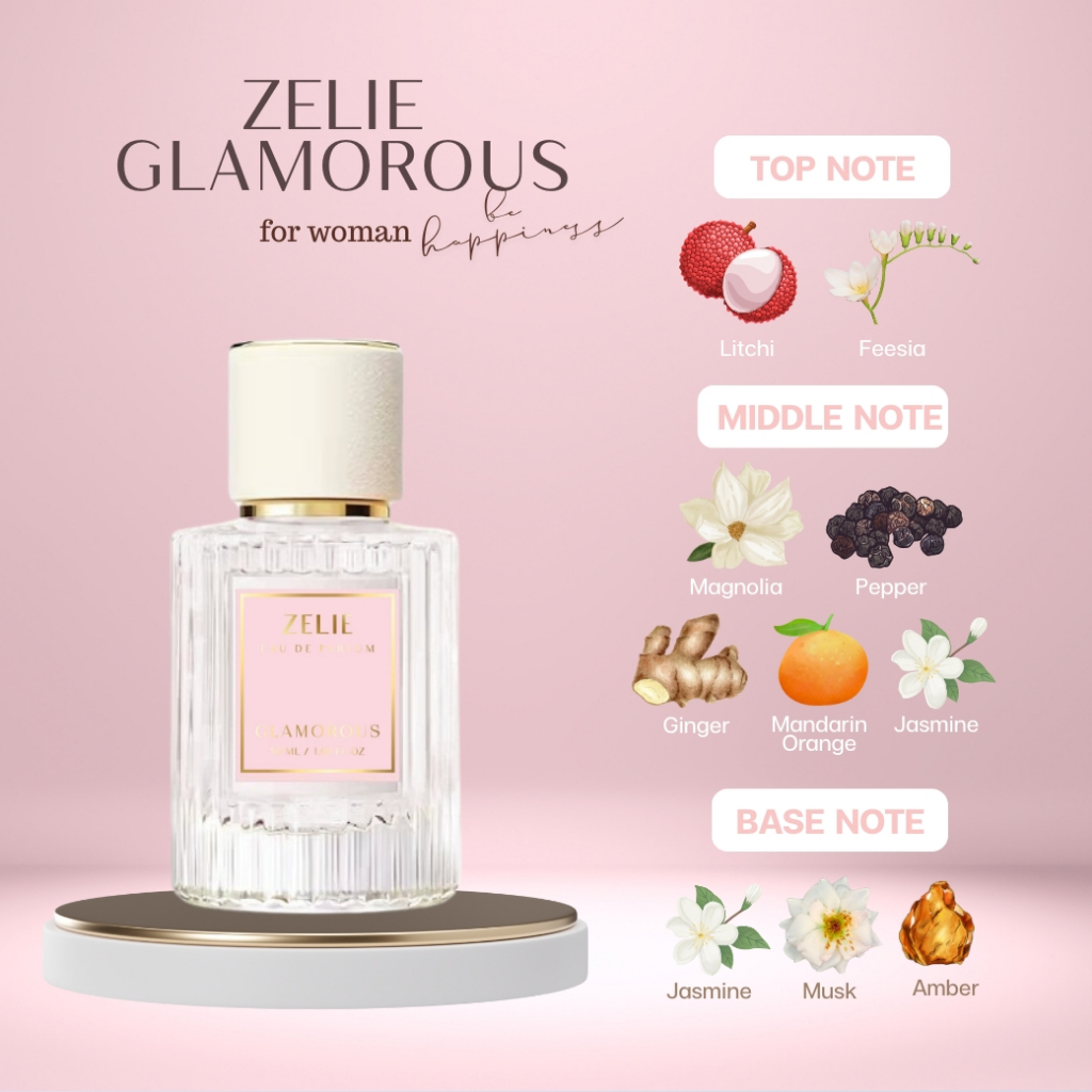 น้ำหอม Zelie กลิ่น Glamorous สำหรับผู้หญิง กลิ่นน่ารัก น่าสนใจ หอมติดทนนาน ใช้หัวน้ำหอมแท้จากฝรั่งเศส