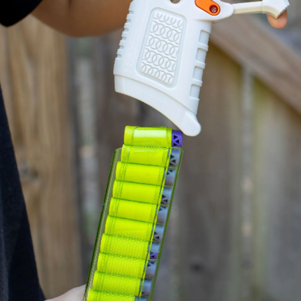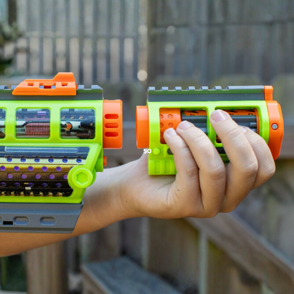 - รางเสริมด้านล่าง เปิดโอกาสให้คุณปรับแต่งได้เต็มที่ เหมาะสำหรับติดอุปกรณ์เพิ่ม เช่น Dart Zone Blaster Charms