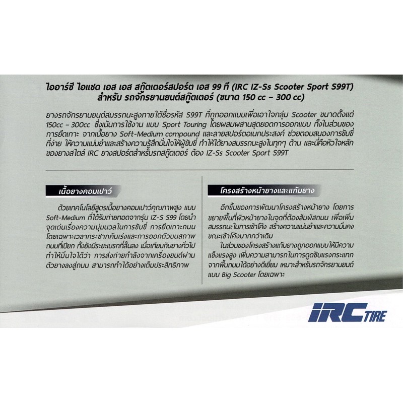 ยางที่ถูกพัฒนาสมรรถนะและถ่ายทอดเทคโนโลยียางคอมเปาว์จากยางรุ่นพี่อย่าง IZ-S Supersport S99 โดยยางตัวนี้เป็นยางที่เน้นการใช้งานตั้งแต่ การขับขี่บนท้องถนนทั่วไป จนถึงการขับขี่ด้วยความเร็วสูง ในสไตล์ Big Scooter Sport IZ-Ss