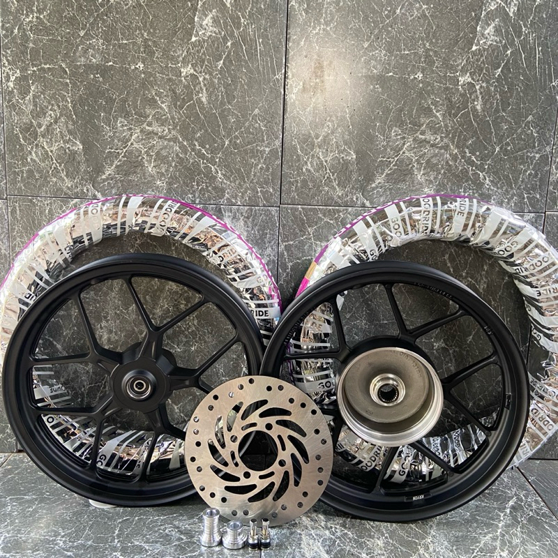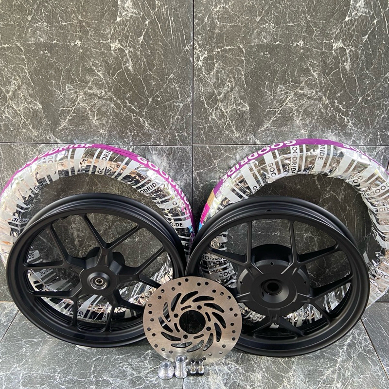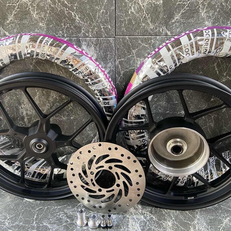 ล้อแม็ก+ยางเรเดียล (ไม่ใช้ยางใน) PCX150 ปี2018-2021 พร้อมชุดแปลง จานดิส+บูช ครบชุด ขนาดแม็ก 1.85/2.15*14 สีดำ แถมจุ๊บเลส