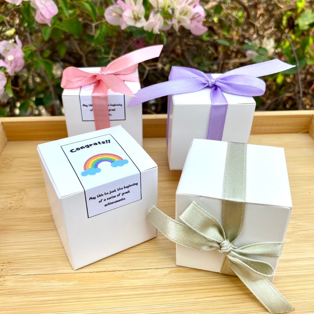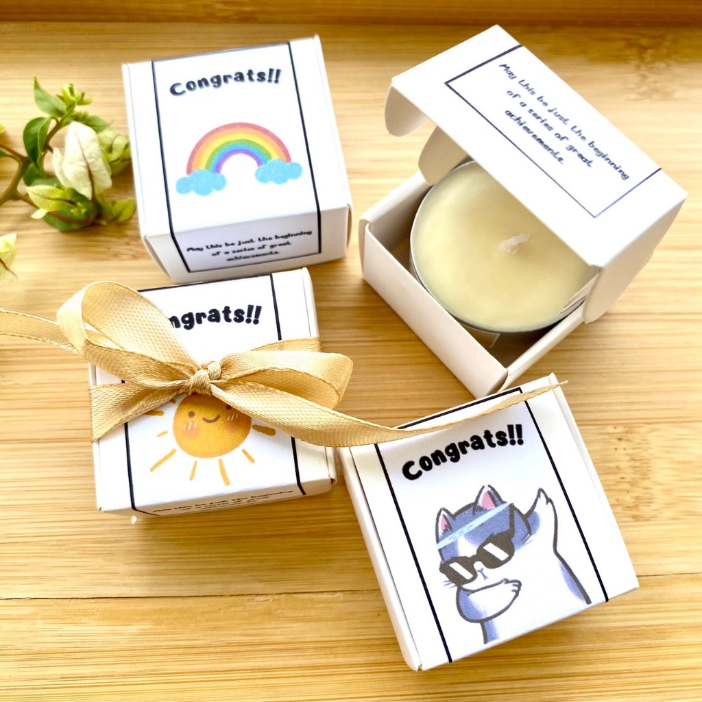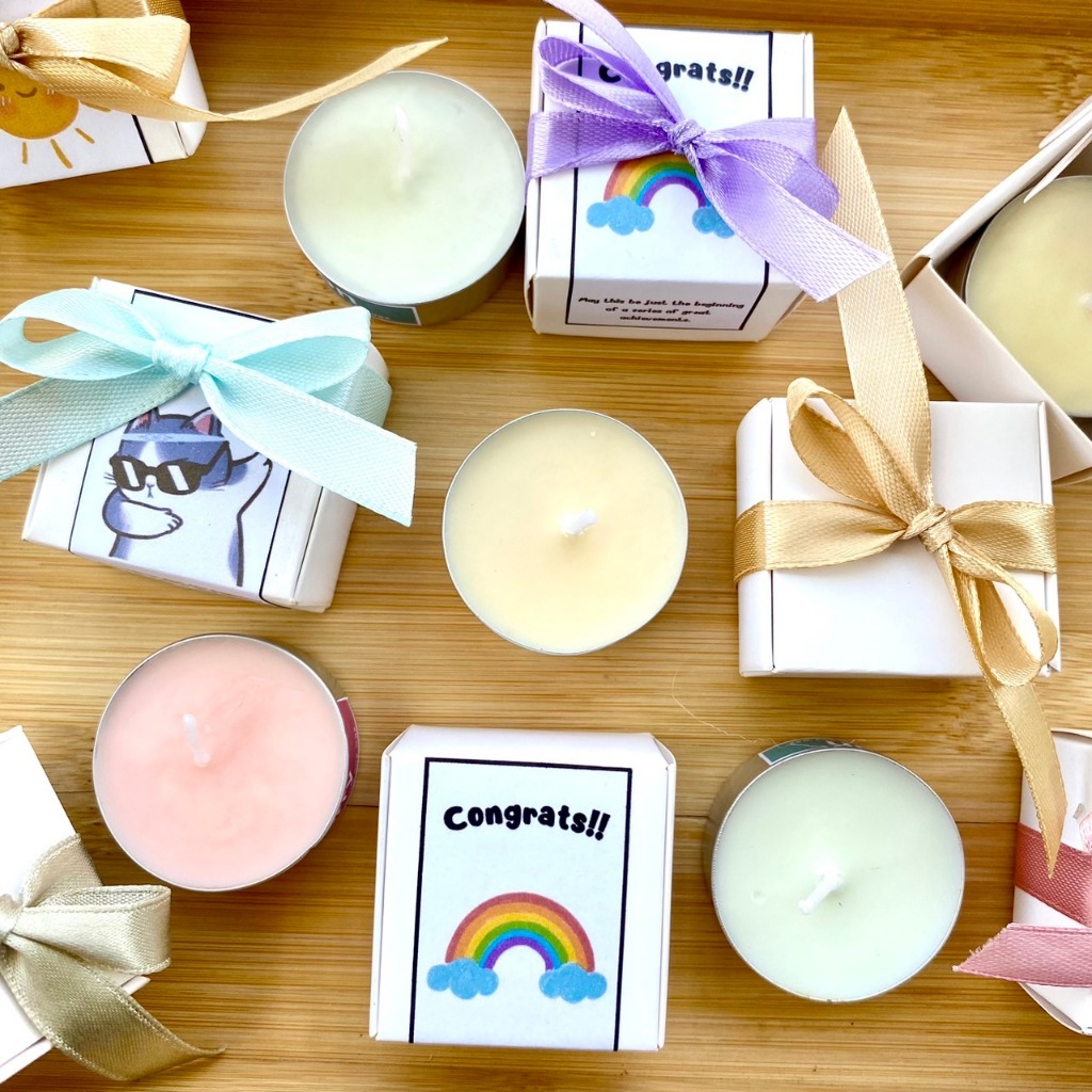 - 15g tealight+กล่องผูกโบว์ริบบิ้น พร้อมSticker( hbd, congrat,have a good day, thank you, Valentine, Chinese newyear, marry Christmas, happy new year เลือกได้ค่ะ)