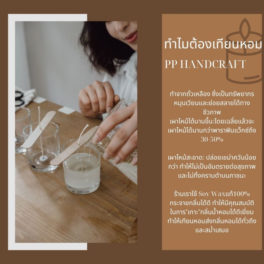 Soy Wax แท้100% ไม่มีผสมสารตัวอื่นๆที่ทำให้ขึ้นรูปแข็งได้หรือสารเคมีเติมเเต่งอื่นๆ (No Additive)