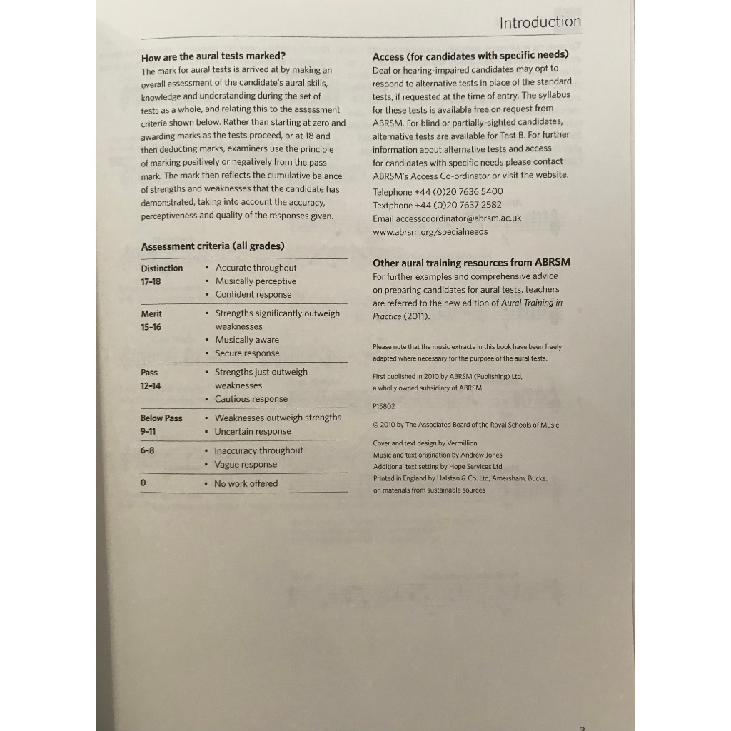 Aural tests are an integral part of all ABRSM Practical graded music exams. The Specimen Aural Tests provide teachers and students with many practice examples of the tests to use as part of a music lesson or when preparing for an exam. This volume covers Grades 4-5 and includes: practice examples for each test in a range of musical styles the examiner rubrics (the exact words that will be used by the examiner to deliver the tests), so that candidates can be fully prepared for what will happen on the day descriptions of the tests as they appear in the syllabus model answers, where appropriate, as a guide to the sort of responses that would be successful in the exam The Specimen Aural Tests volumes are each available in versions with or without CDs.
