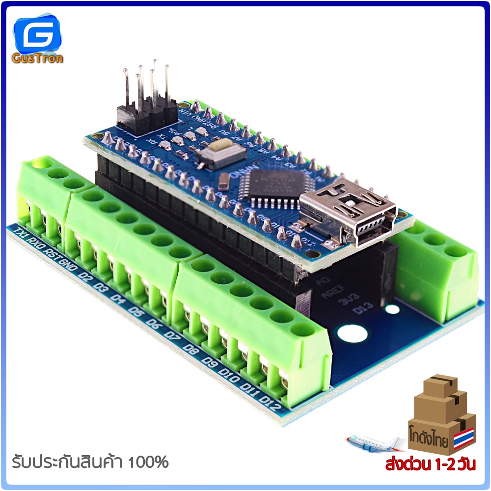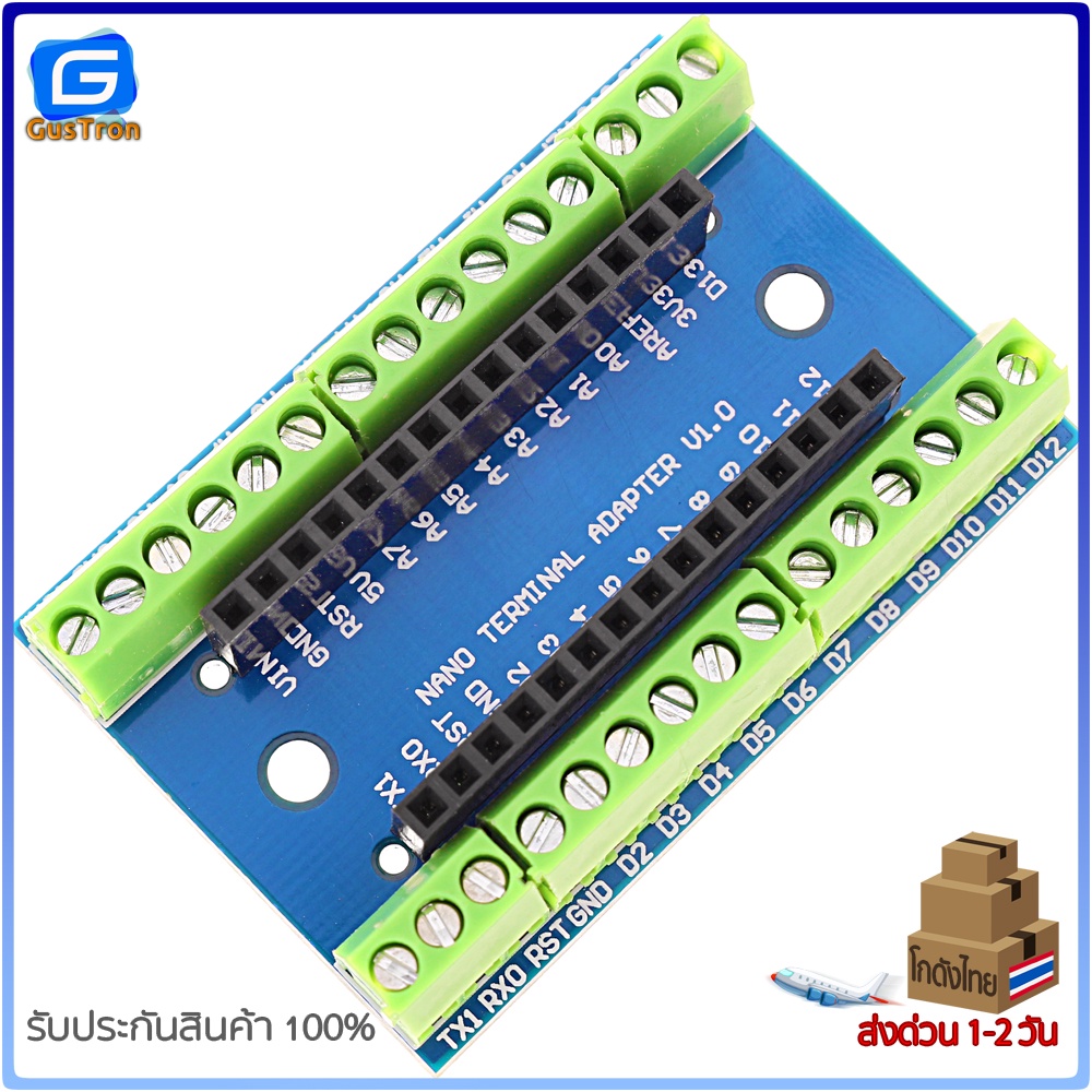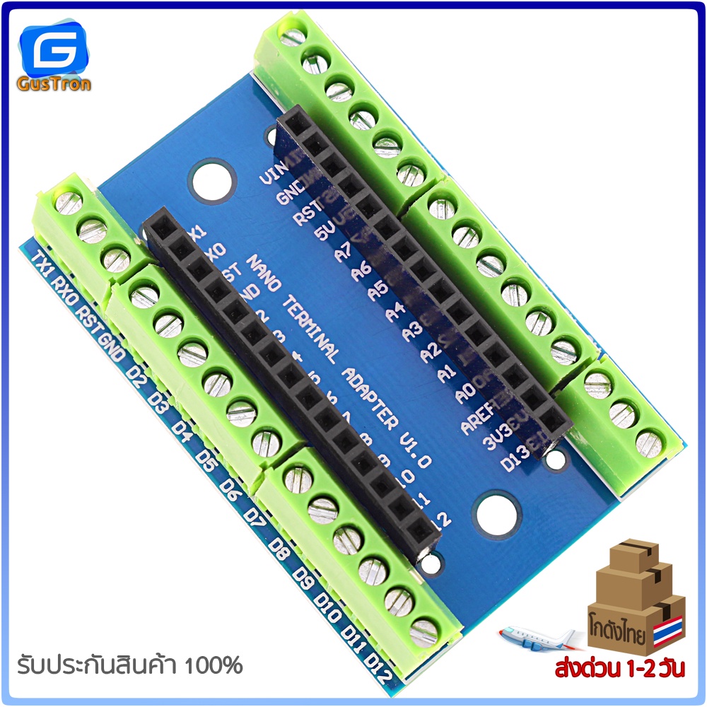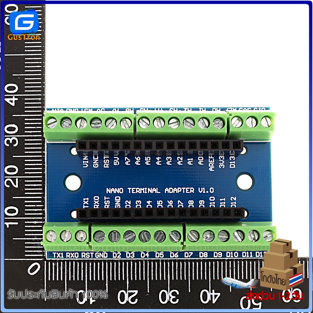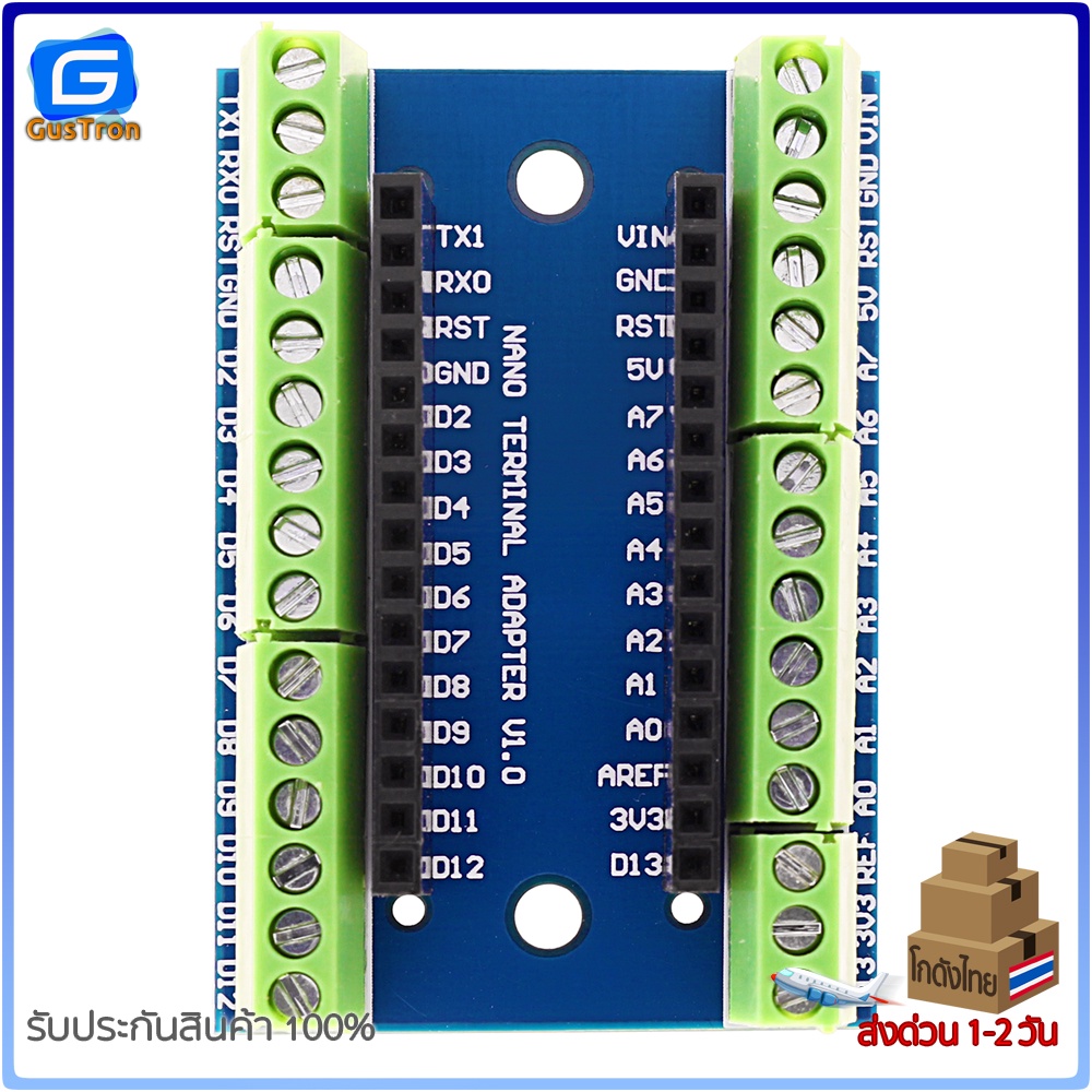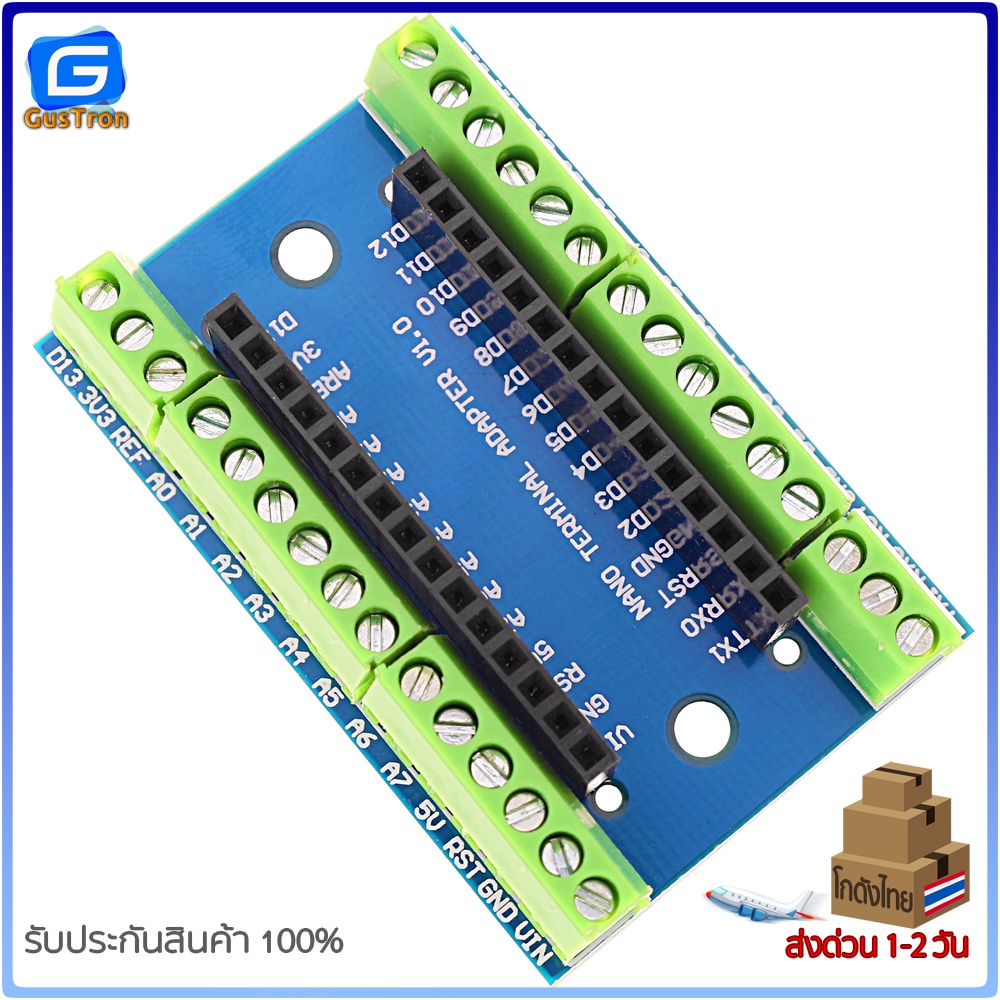 บอร์ดขยายขา Arduino Nano V1.0 เป็นแบบ screw terminal พร้อมสกรีนตำแหน่งขา สามารถต่อขากับอุปกรณ์สายไฟอื่น ๆ ได้อย่างแน่นหนา สำหรับงานลุย ๆ เช่น smart car ,robot