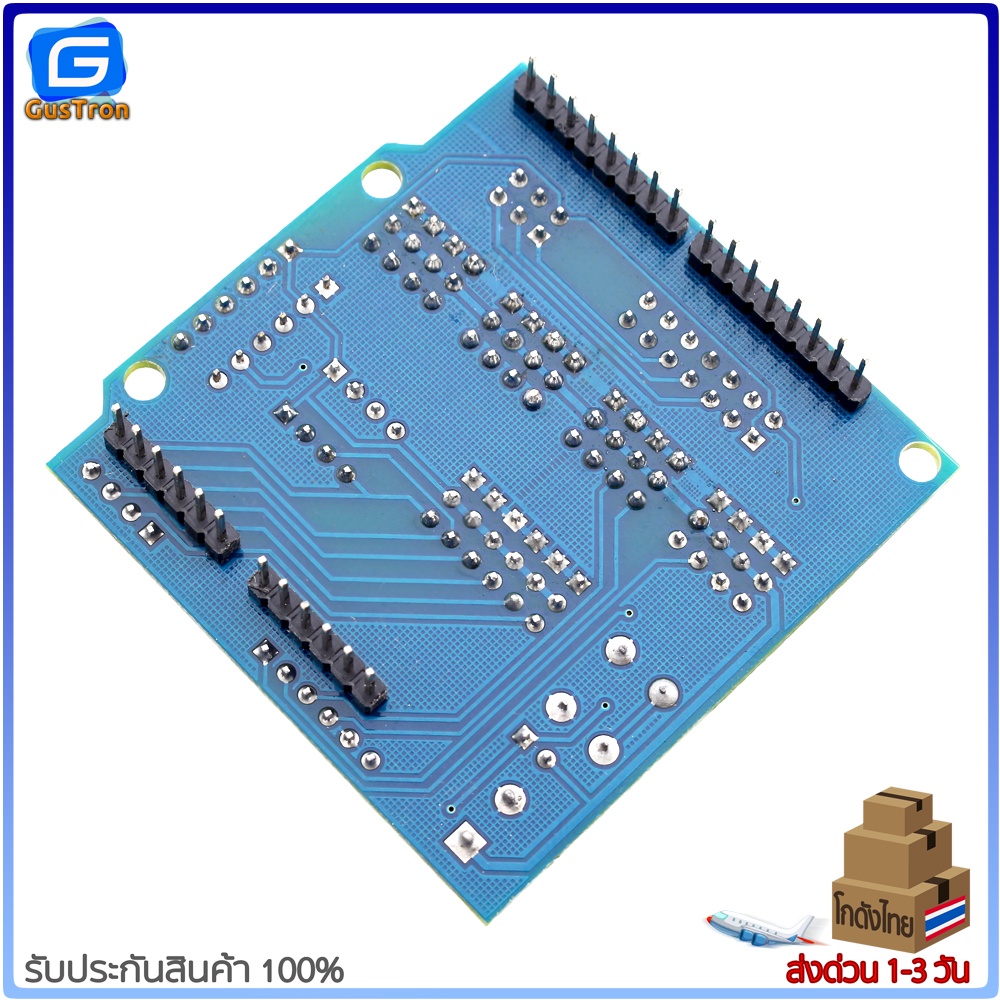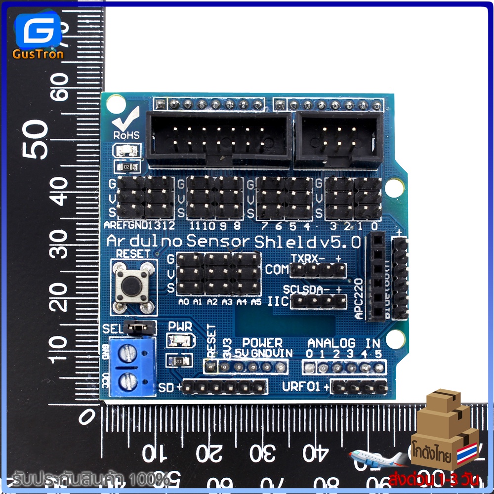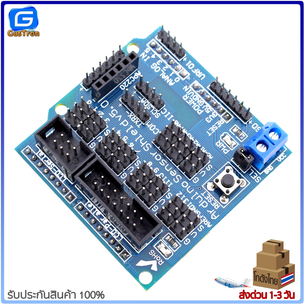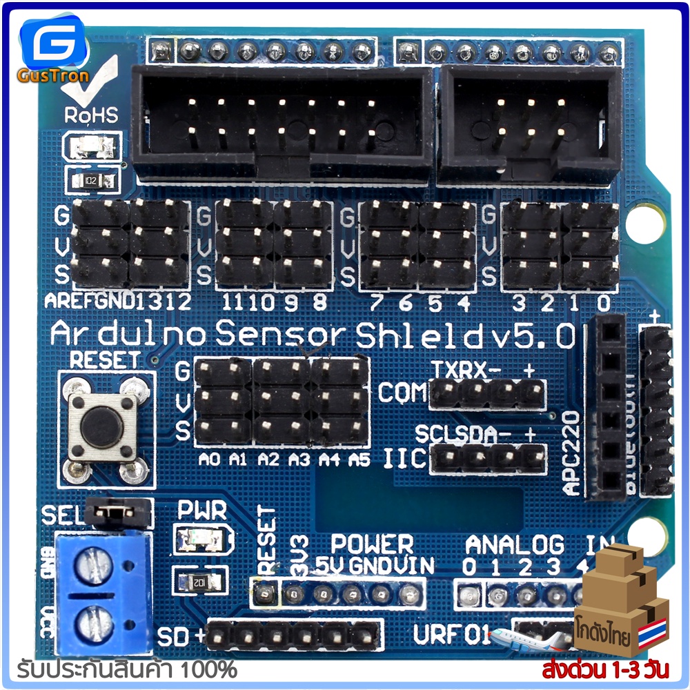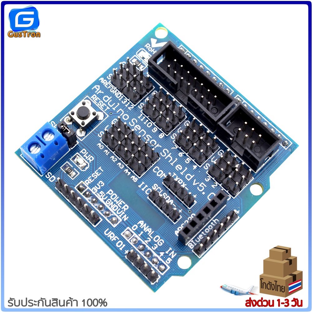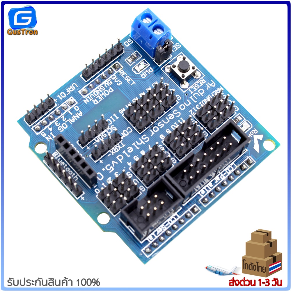 บอร์ดขยายขาสำหรับทดลอง Uno R3 Sensor Shield V5 Expansion Board ขยายขา Arduino ออกทุกขาให้ต่อสายไฟทดลองได้ง่าย พร้อมสกรีนบอกตำแหน่งแต่ละขาชัดเจน มีจัดช่องต่อสำหรับการสื่อสารอินเตอร์เฟซแบบ I2C , Serial , Parallel ,Analog , Digital รองรับการเชื่อมต่อกับโมดูล APC220 , Bluetooth , Ultrasonic , จอ LCD ทำให้ทดลอง Uno (Arduino-Compatible) ได้ง่ายขึ้นไม่ต้องต่อสายไฟหลายเส้น