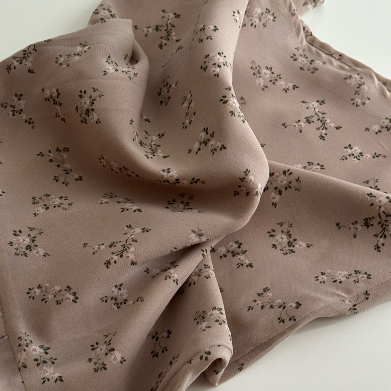 เนื้อผ้าจะเป็นผ้าชีฟองเนื้อบาง ด้านในมีซับในสีน้ำตาล สีเข้มไม่ต้องกังวลว่าจะซีทรู ลายดอกไม้สกรีนชัด เนื้อผ้ามีควางบางพลิ้ว เหมาะกับสาวๆที่เป็นสาวกผ้าชีฟอง