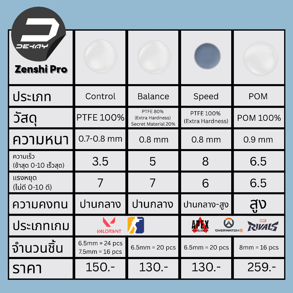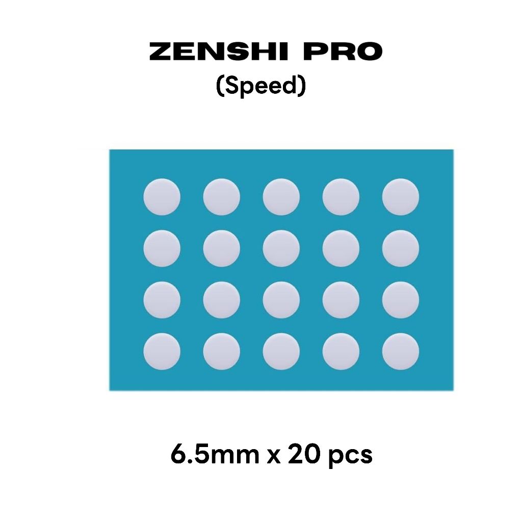 Zenshi Pro ก็จะสามารถเข้ามาตอบโจทย์ในทุกจุดที่กล่าวมาข้างต้น เนื่องจากเป็นฟีทชนิด DOT ที่มีหลายชนิดให้เลือก ขอบมีความโค้งมน จะช่วยเพิ่มความ Smooth ในการกวาดเมาส์ มี Stopping Power ที่ดี ควบคุมเมาส์ได้อย่างแม่นยำ นอกจากนั้นยังทนความร้อนได้สูง มีอายุการใช้งานนาน โดยใน 1 set นั้นมีจำนวนขั้นต่ำ 16 ชิ้น ซึ่งเพียงแค่มี Zenshi Pro ผู้ใช้งานก็สามารถเลือก Custom การเคลื่อนที่ และความเร็วของเมาส์ ได้ตามต้องการด้วยตัวเอง โดย Zenshi Pro มีมาด้วยกันหลายชนิด ซึ่งมีคุณสมบัติการใช้งานที่ต่างกันไป