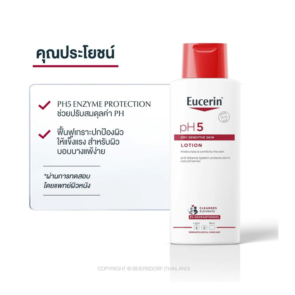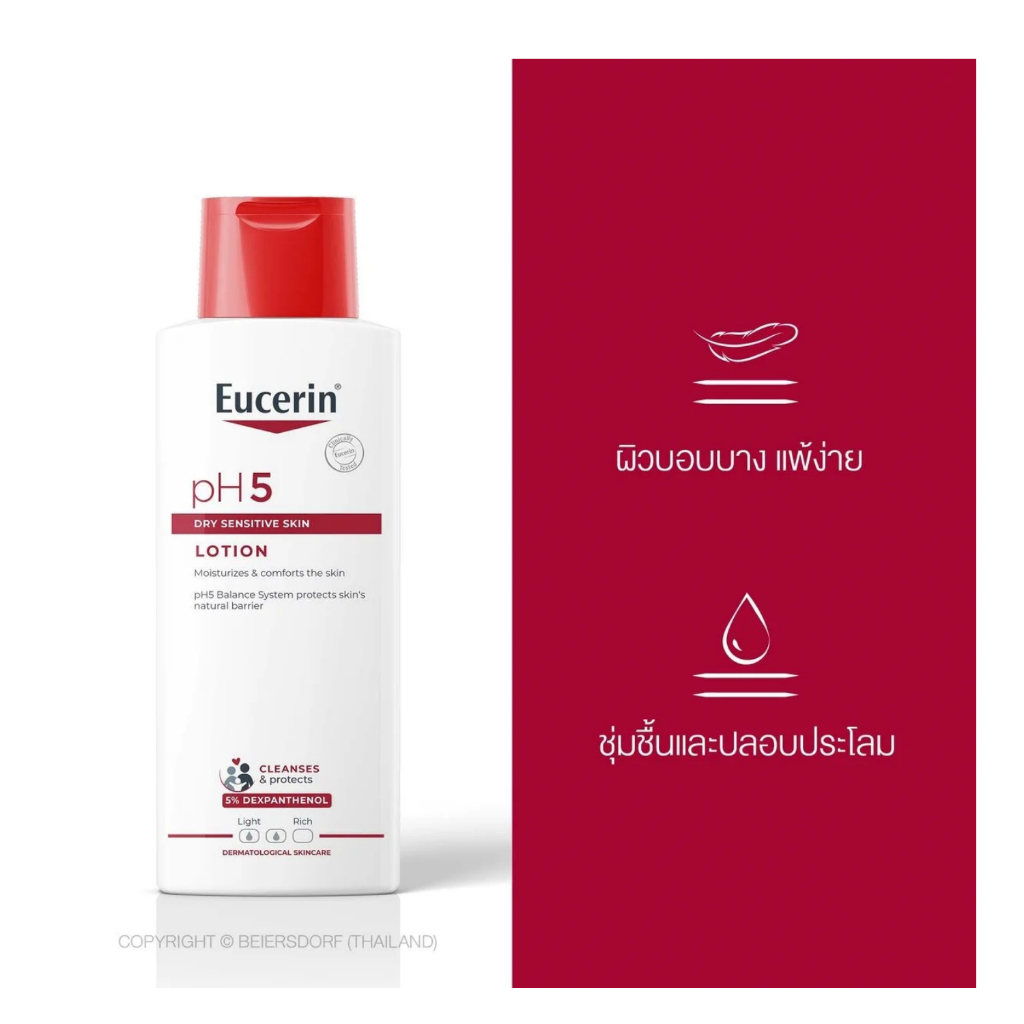 ยูเซอริน พีเอช 5 โลชั่น ครีมบำรุงผิวกาย เนื้อโลชั่นเข้มข้น แต่ไม่หนืด ทาเกลี่ยบนผิวได้ง่าย มีสีขาวขุ่น มีส่วนผสมของน้ำหอม แต่ให้กลิ่นหอมจางๆไม่ฉุ่น ซึมซาบเร็วช่วยเพิ่มและกักเก็บความชุ่มชื่นยาวนาน ด้วยนวัตกรรม pH5 EnzymeProtection พัฒนาเพื่อผิวบอบบางแพ้ง่าย รวมส่วนผสมของ pH5 Citrate Buffer , Dexpanthenol และ Glycerin ที่พิสูจน์แล้วว่าช่วยคงสมดุลความชุ่มชื่นพร้อมดูแลปกป้องการทำงานของเอ็นไซม์ที่มีอยู่ในผิว(ชั้นอิพิเดอร์มิส) เพื่อปกป้องผิวตามธรรมชาติ ผิวนุ่มชุ่มชื่นยาวนาน 24 ชั่วโมง