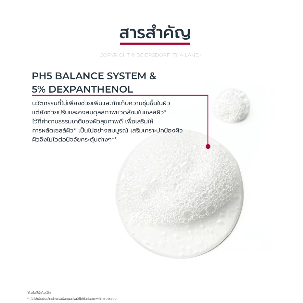 pH5 Balance System & Dexpanthenol นวัตกรรมที่ไม่เพียงช่วยเพิ่มและกักเก็บความชุ่มชื้นในผิว แต่ยังช่วยปรับและคงสมดุลสภาพแวดล้อมในเซลล์ผิว ไว้ที่ค่าตามธรรมชาติของผิวสุขภาพดี เพื่อเสริมให้การผลัดเซลล์ผิวเป็นไปอย่างสมบูรณ์ เสริมเกราะปกป้องผิว ผิวจึงไม่ไวต่อปัจจัยกระตุ้นต่างๆ ■ ใช้ได้ทุกวัน หรือบ่อยเท่าที่ตามต้องการ ■ ปราศจากสบู่ที่มีความเป็นด่าง ■ สามารถใช้กับผิวบอบบางแพ้ง่าย รวมถึงผิวแห้งระคายที่เกิดจากไรฝุ่นและขนสัตว์ และผู้ที่มีแนวโน้มเป็นภูมิแพ้