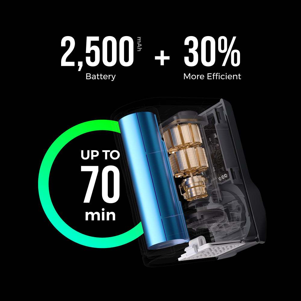 - อาบได้สูงสุด 5 ครั้งต่อการชาร์จ: แบตเตอรี่ 2,500 mAh (9.25Wh) พร้อมปั๊มที่ประหยัดพลังงานขึ้น 30% สามารถใช้งานได้ต่อเนื่องนานถึง 70 นาที เพียงพอสำหรับการอาบน้ำ 14 นาทีจำนวน 5 ครั้งต่อการชาร์จเร็วผ่าน USB-C เพียงครั้งเดียว