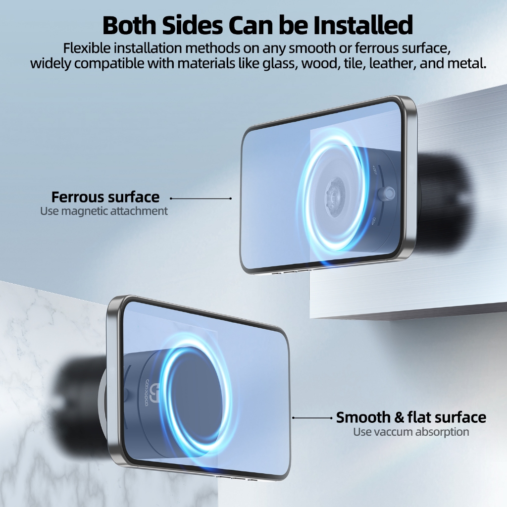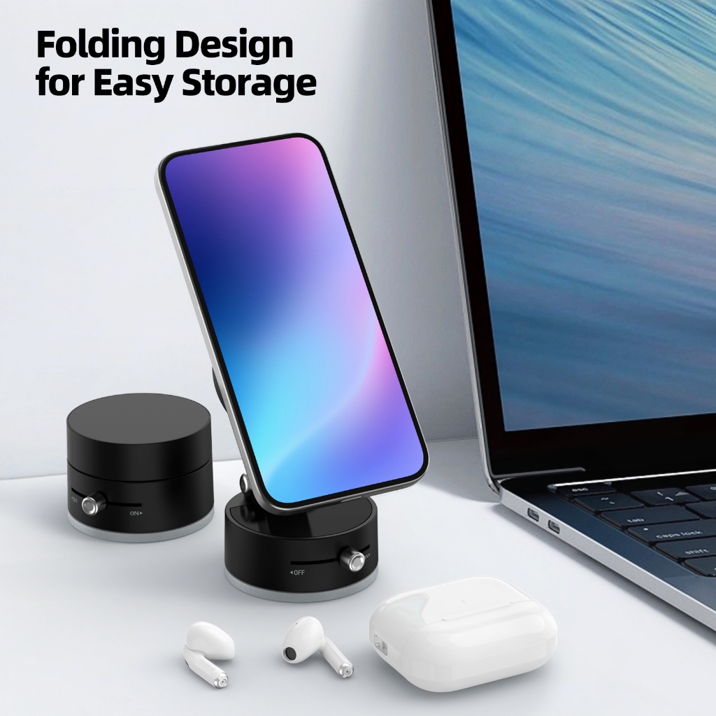 Two -way Switchable Installation: This foldable phone stand features a powerful suction cup for a secure grip on various smooth surfaces of glass, plastic, wood, and tile, and a magnetic end to keep your phone stable and in place. Also, you can use the magnetic side to install it on any ferrous surface like a fridge, iron shelf, iron bed, etc while using the suction cup to hold the phone.