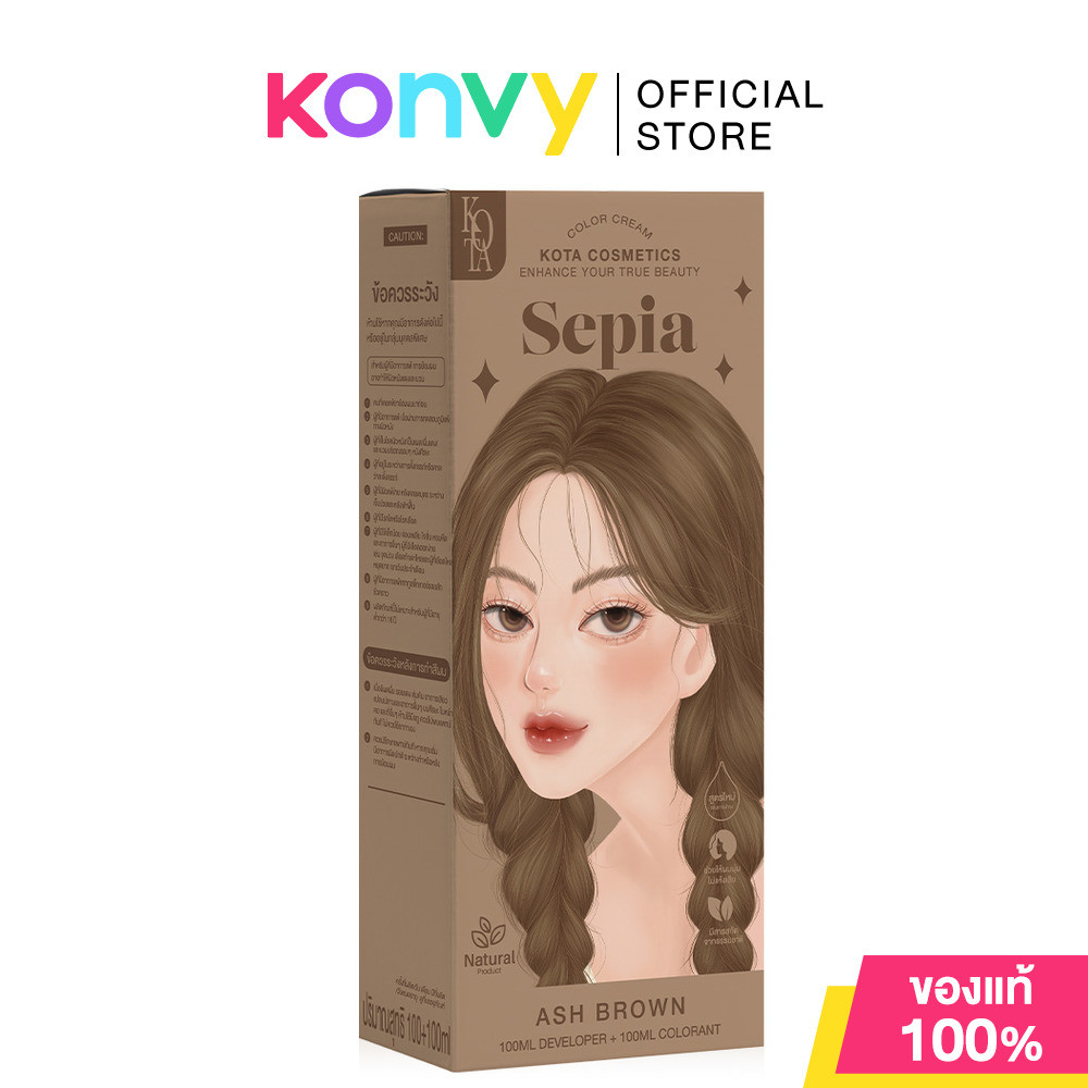 Kota cosmetics Color Cream Sepia 200ml ครีมย้อมผม ประกอบด้วยสารสกัดจากธรรมชาติเช่นโสมเกาหลีกลิ่นไม่ฉุน มอบสีสม่ำเสมอและชัดเจนได้ โดยสีผมจะออกมาสดใสและคงทนไว้นาน สูตรที่ทนทานและไม่ทำลายเส้นผม โดยสารสกัดธรรมชาติจะซึมเข้าสู่เส้นผม ทำให้เส้นผมเสียน้อยกว่าหลังจากผ่านการทำสี นอกจากนี้ช่วยบำรุงเส้นผมในระหว่างการทำสีได้เป็นอย่างดี