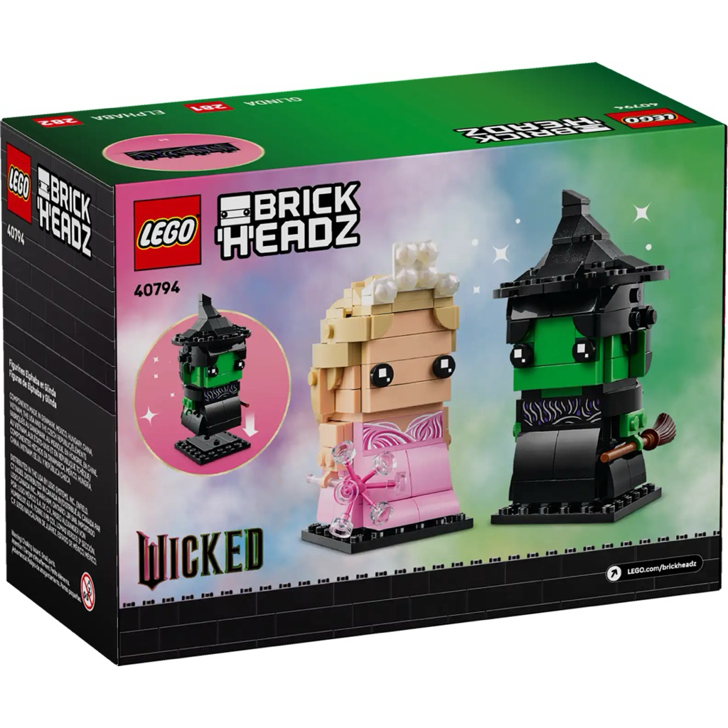 Give fans of Wicked a magically creative treat with LEGO® BrickHeadz™ Elphaba & Glinda Figures (40794). The 2 authentically detailed characters are fun to build, play with and put on display for all to admire. Featuring sturdy baseplates, the BrickHeadz characters make an awesome addition to any Wicked merchandise collection and look great displayed alongside other BrickHeadz figures (sold separately).