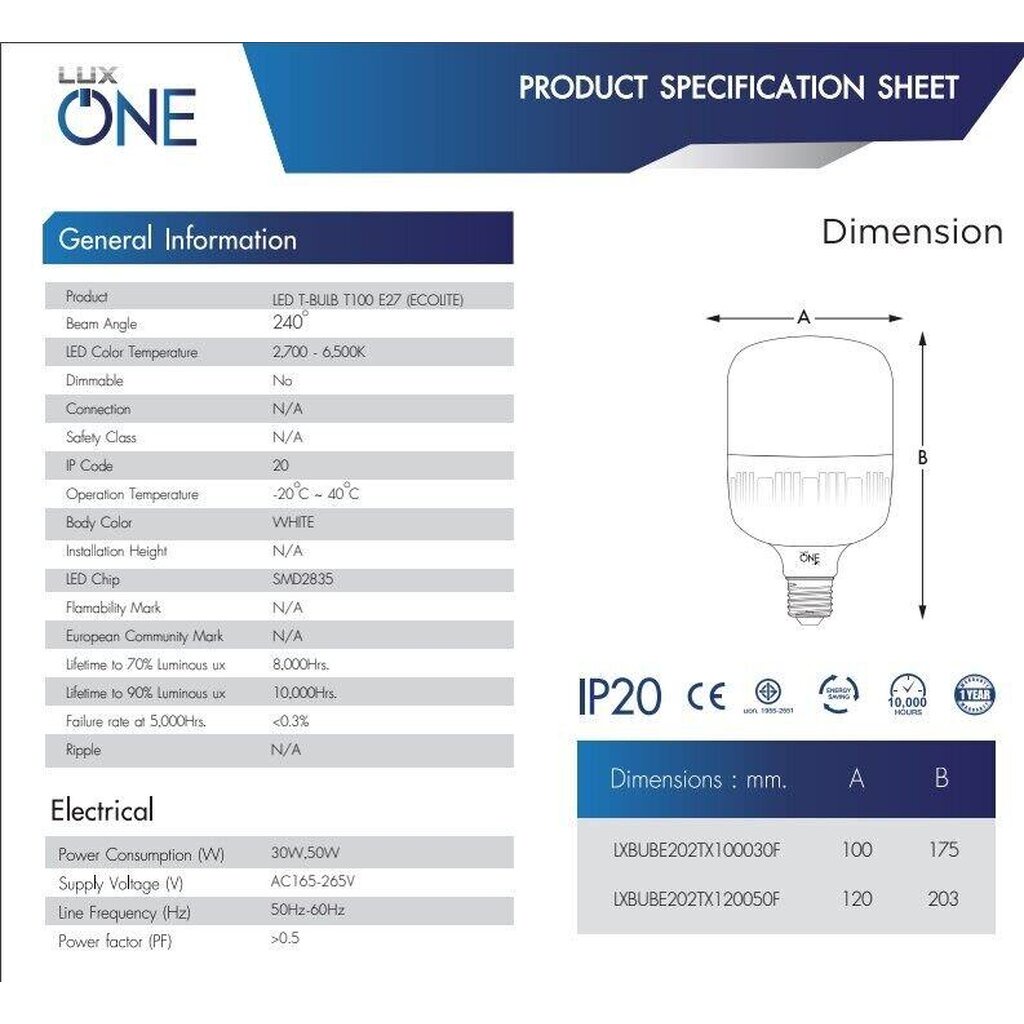 หลอดไฟ LED T-BULB ยี่ห้อ LUX ONE รุ่น ECOLITE ขนาด 30W และ 50W