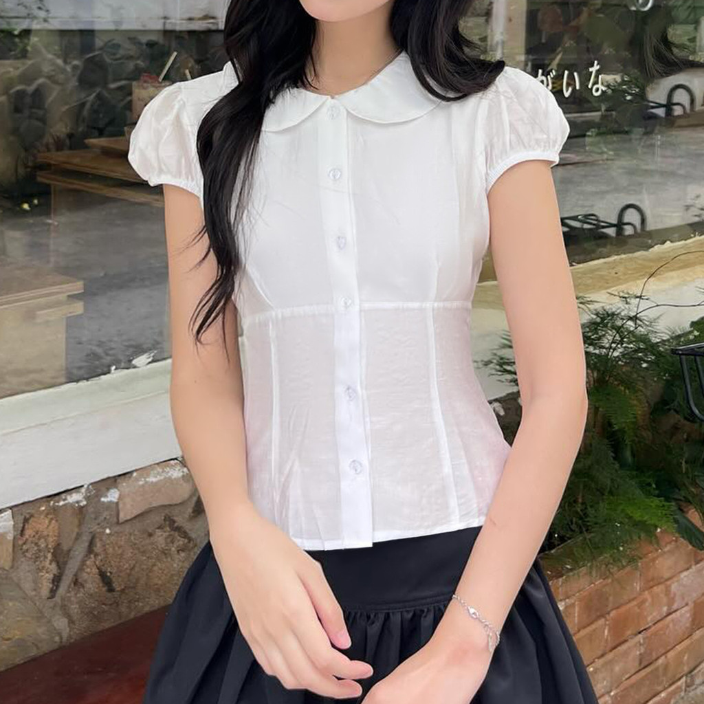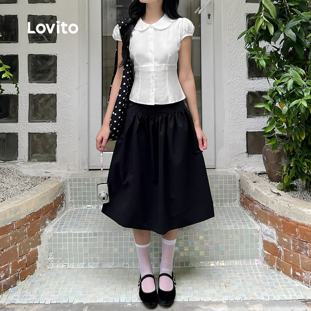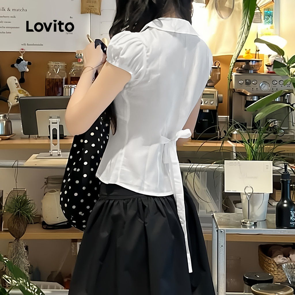 Lovito เสื้อเบลาส์ผู้หญิงสีขาวลายกระดุมน่ารัก สําหรับฤดูใบไม้ผลิ/ฤดูร้อน L166AD167