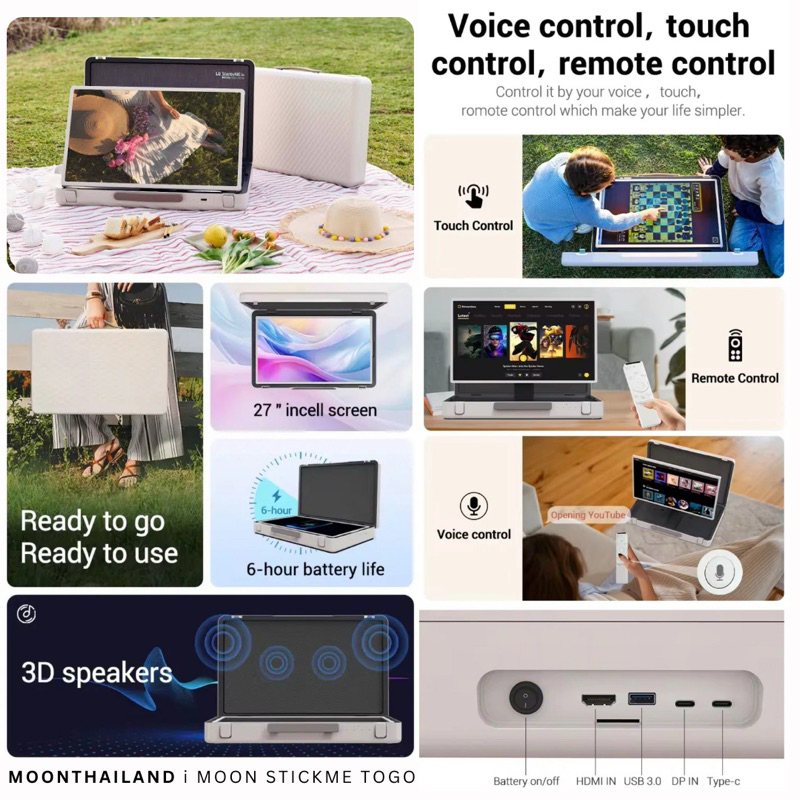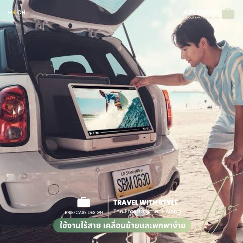 ปลดปล่อยความอิสระของความบันเทิงแบบไร้สายด้วยแบตเตอรี่ในตัวที่ใช้งานได้ถึง 6 ชั่วโมง Moon StickMe Go 27” Aplosign Smart Briefcase สามารถเปลี่ยนทุกที่ให้เป็นโซนความบันเทิง