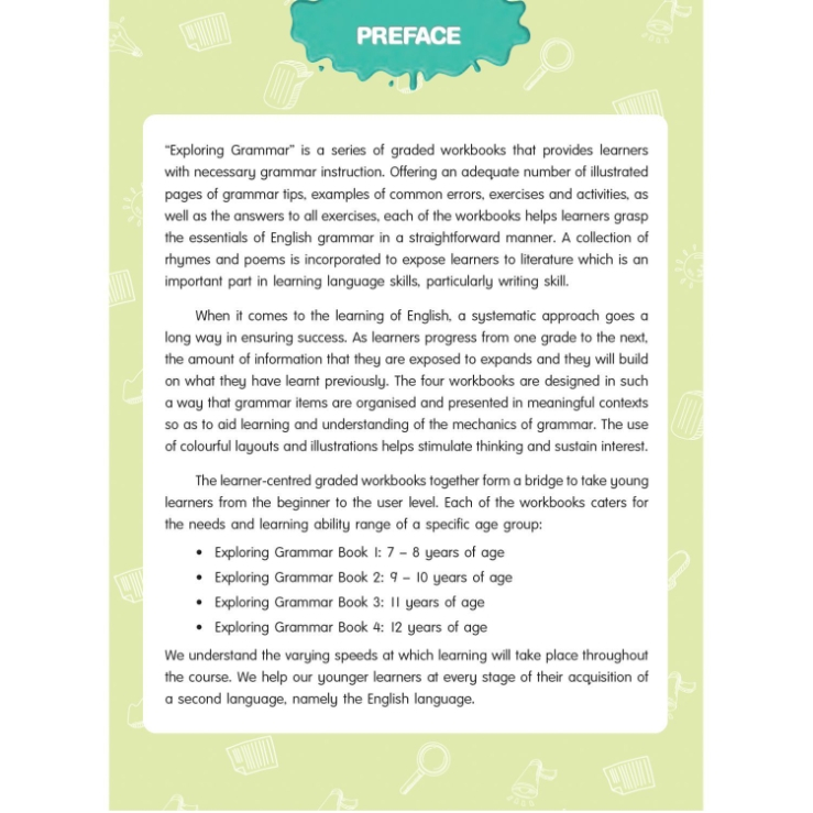 Exploring Grammar Step by Step is a series of multi-level English grammar workbooks for young learners. The series combines informative content that strongly focuses on grammar and vocabulary within an easy-to-understand structure. Each of the workbooks is written to suit the learning needs of a specific age group and ability range. From the early level to the upper level, language skills are developed and practised through clear vocabulary and point-by-point grammar presentations as well as graded exercises.