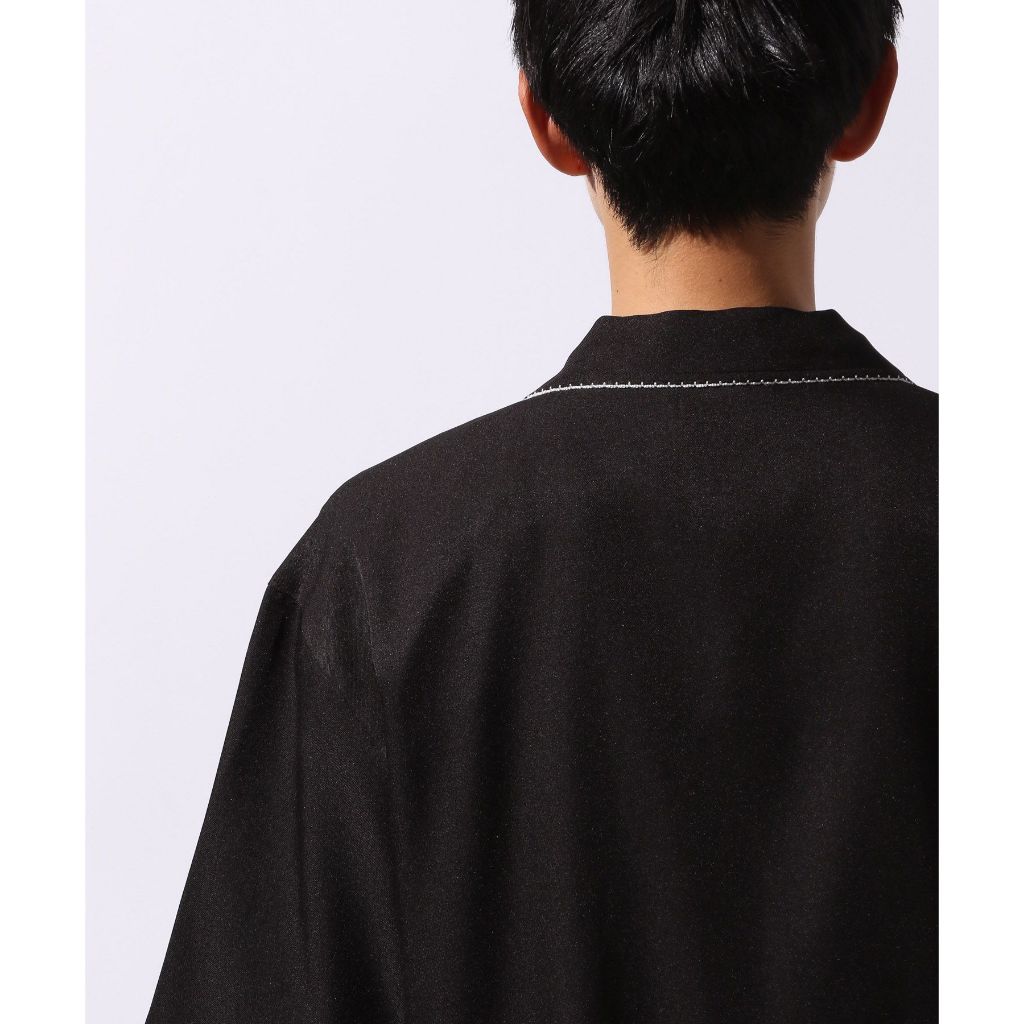 ◆ เสื้อเชิ้ตคอเปิด ดีไซน์จากผ้าแบบเมลานจ์ พร้อมลายปักและการเย็บริมแบบแบลงเก็ตสติช เพิ่มความโดดเด่นด้วยสีตัดกัน