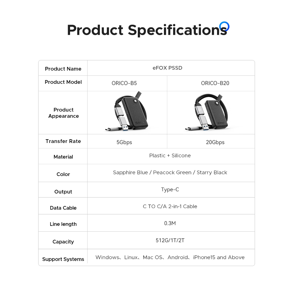 เมื่อเทียบกับ SSD แบบพกพาอื่น ๆ ในตลาด ORICO-B20 เร็วกว่าสามเท่าให้การถ่ายโอนไฟล์ขนาดใหญ่ที่รวดเร็วและมีเสถียรภาพมากขึ้น เข้ากันได้กับ Windows, Linux, Mac OS และ Android เพื่อให้มั่นใจได้ถึงประสิทธิภาพที่มั่นคงบนแพลตฟอร์มต่างๆ