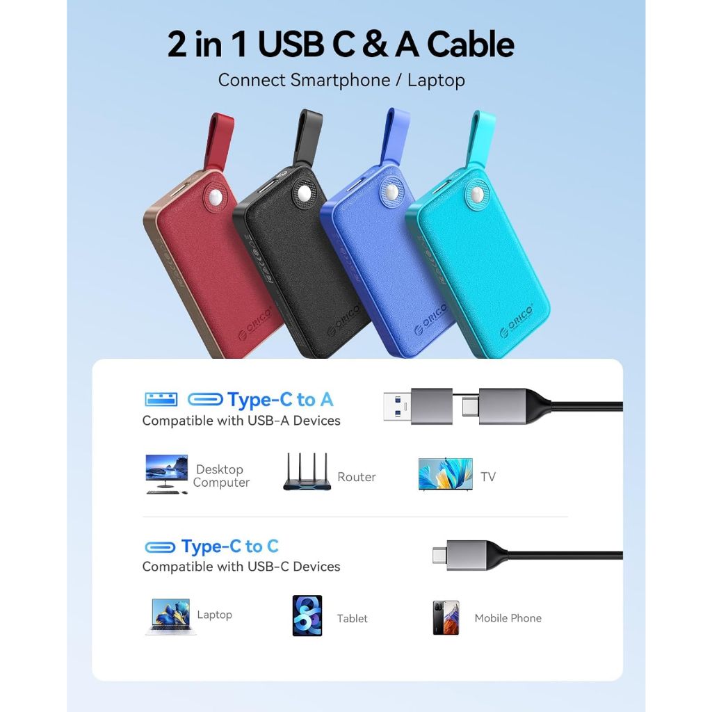 Orico-b20 เข้ากันได้กับโทรศัพท์คอมพิวเตอร์กล้องและคอนโซลเกม สายเคเบิลข้อมูล 2-in-1 รองรับอุปกรณ์หลักทั้งหมดอนุญาตให้เชื่อมต่อโดยตรงกับ iPhone 16 series, Android, HarmonyOS ฯลฯ เพื่อการถ่ายโอนไฟล์ไปยัง SSD แบบพกพาที่ง่ายดายช่วยประหยัดพื้นที่จัดเก็บโทรศัพท์