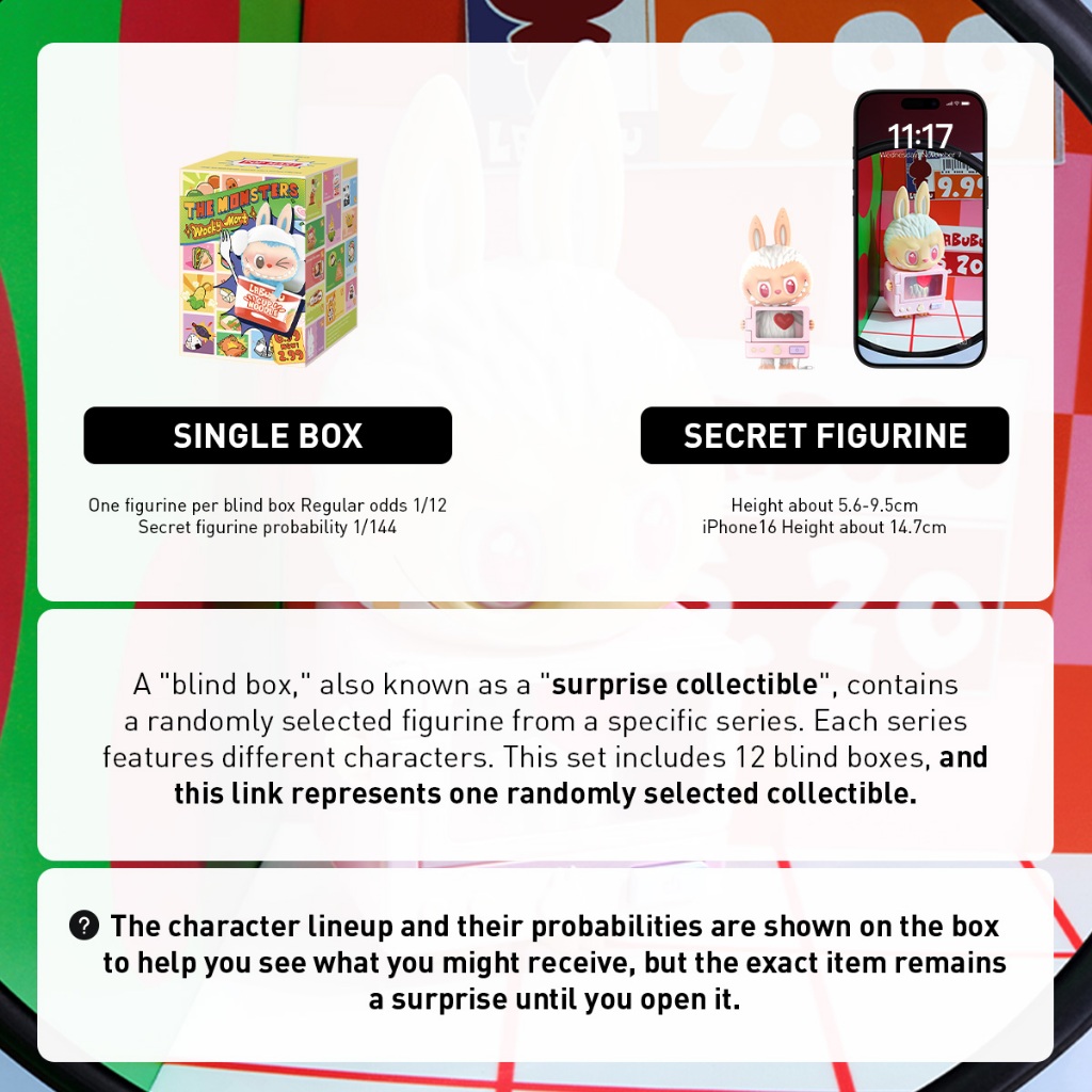 Whole box: For a complete set of blind boxes (not repeated), it is possible to issue a hidden one. If there is a duplicate one when purchasing the whole box, please contact us for an exchange.