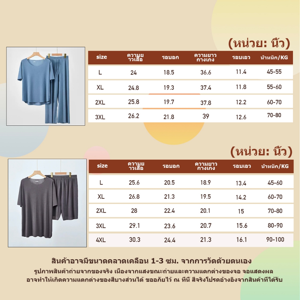4XL:ความยาวเสื้อ 30.3นิ้ว รอบอก 24.4นิ้ว ความยาวกางเกง 21.3นิ้ว รอบเอว16.1นิ้ว