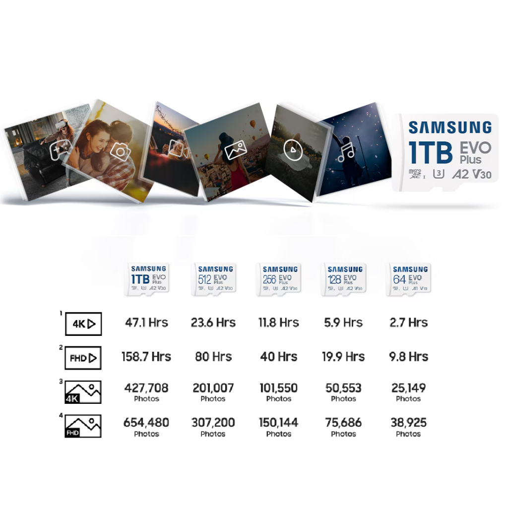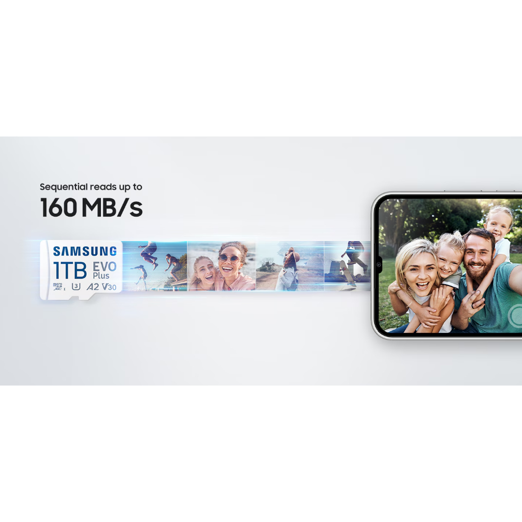 microSD EVO Plus ของ Samsung ได้เพิ่มความจุของหน่วยความจำและฟังก์ชันการทำงานหลายอุปกรณ์ เพื่อให้คุณสามารถมุ่งเน้นไปที่ชีวิต ไม่ใช่เทคโนโลยี การ์ดความเข้ากันได้ UHS-I Speed ​​Class 3 (U3) และ Class 10 นี้เหมาะอย่างยิ่งสำหรับการถ่ายภาพและการบันทึกและเล่นวิดีโอในรูปแบบ Full HD และด้วยความเร็วในการอ่านสูงสุด 130MB/s* และความเร็วในการเขียนสูงสุด 60MB/s* แอปและวิดีโอจึงโหลดเร็วขึ้นและถ่ายโอนไฟล์ได้เร็วขึ้น