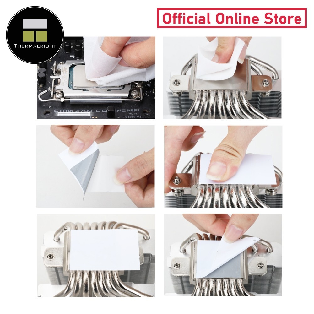 Use the included cleaning cloth to wipe the contact surfaces of the CPU and heatsink base clean, then tear off the transparent protective film, stick the solid-state silicone sheet on the contact surface of the heatsink base and press gently and evenly, wait for 3 minutes, then tear off the opaque protective cover and install the solid-state silicone sheet and the heatsink together on the CPU.