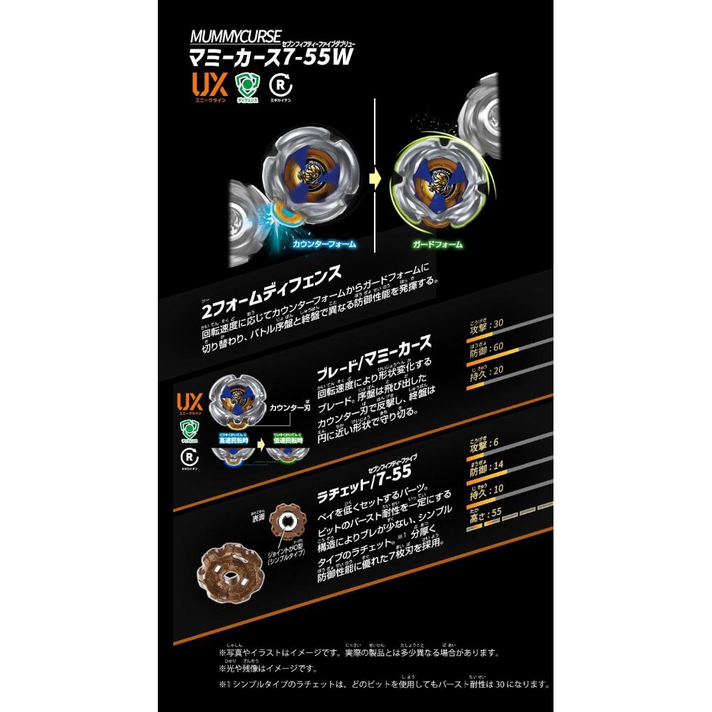 The rare [Mummy Curse 7-55W] is a Beyblade that switches from Counter Form to Guard Form depending on its rotation speed, demonstrating different defensive capabilities at the beginning and end of the battle.