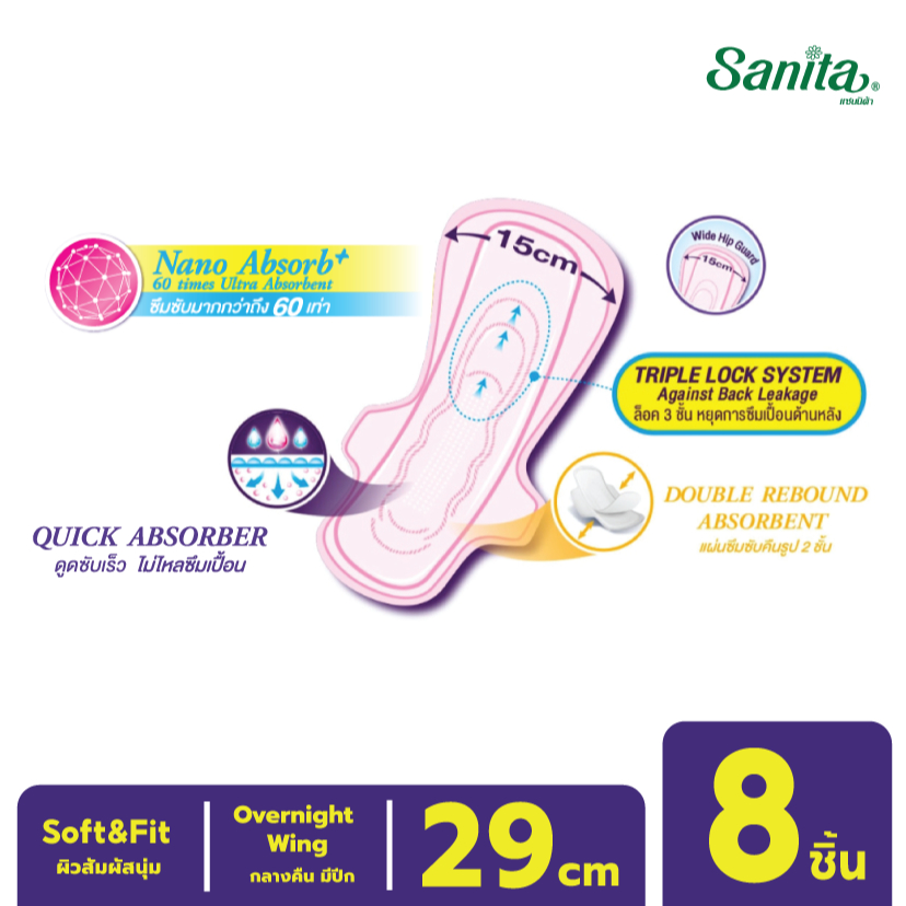 ตัวเลือกที่เลือก [แพ็ค X 6ห่อ] Sanita/แซนนิต้า ผ้าอนามัย ซอฟท์ & ฟิต ผิวสัมผัสนุ่ม กลางคืน มีปีก 29ซม. 8 ชิ้น ฿210
