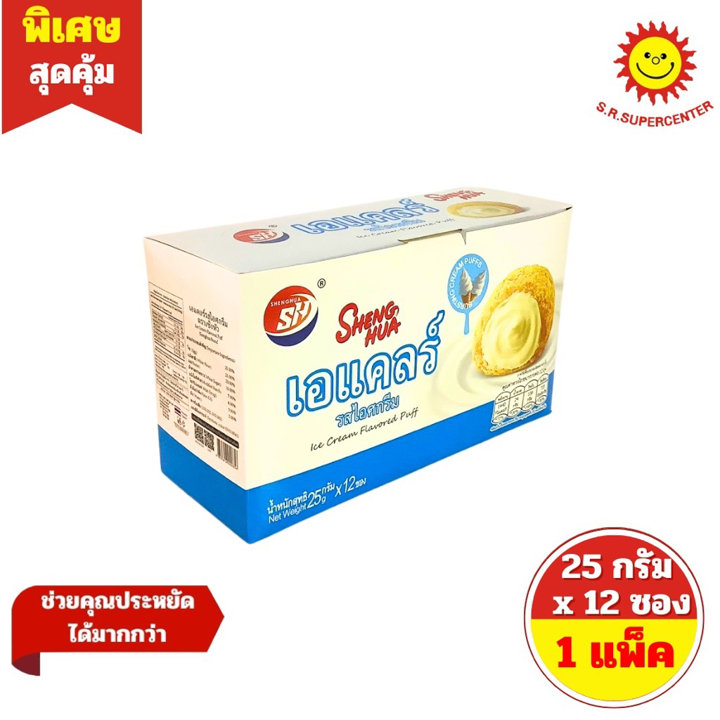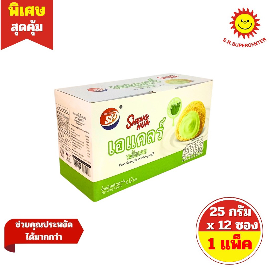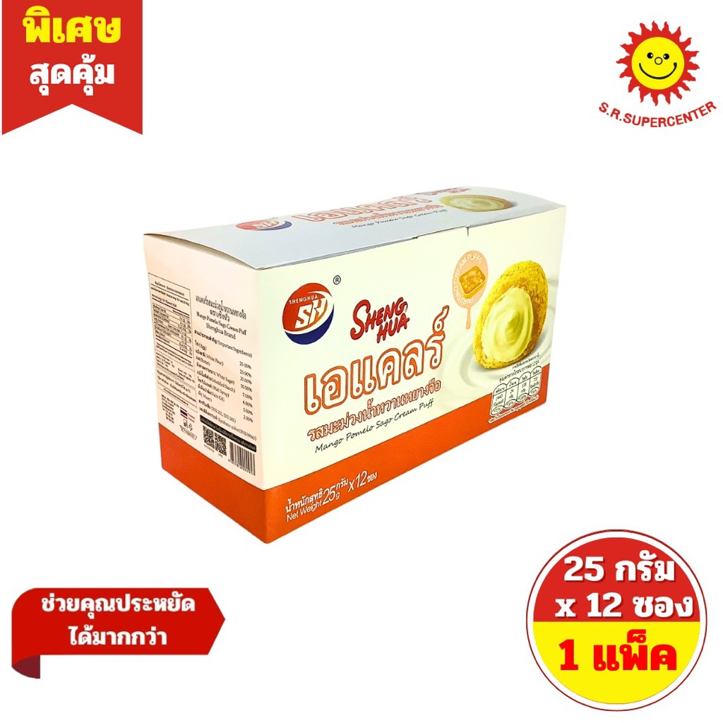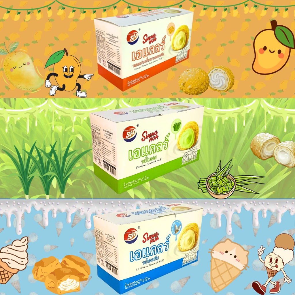 [ 1 กล่อง ] Sheng Hua เซิงหัว ขนมเอแคลร์รสต่างๆ (รสมะม่วงน้ำหวานหยางจือ ,รสไอศกรีม .รสใบเตย) ปริมาณ 25 กรัม x 12 ซอง