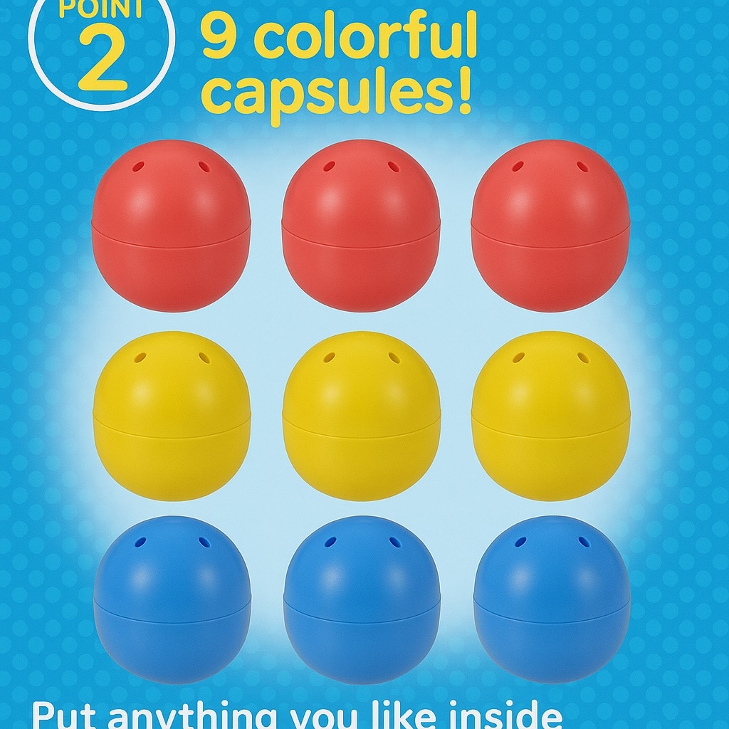 This product, the “Gashapon hine Try,” comes with 3 colorful capsules in each of 3 colors (9 capsules total).