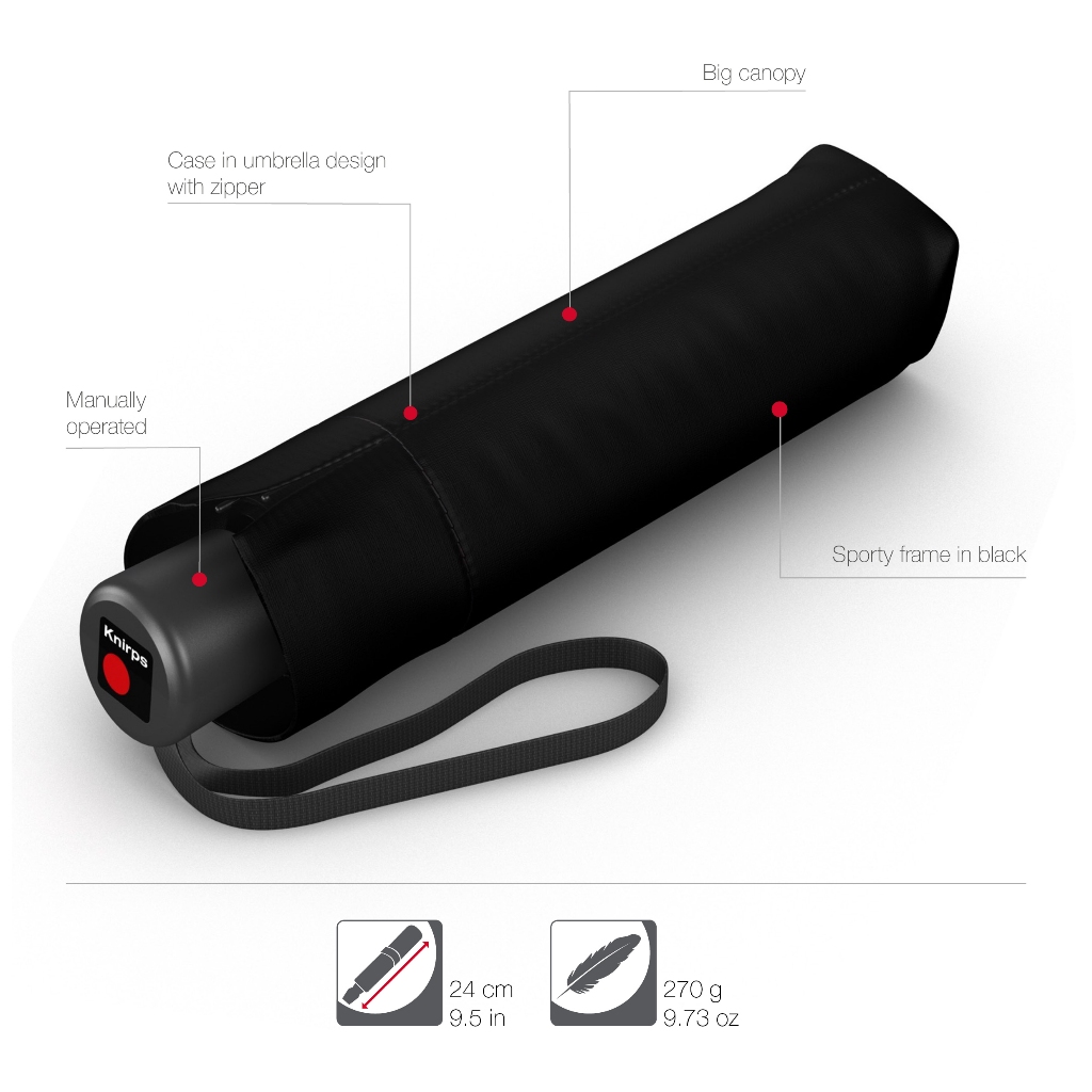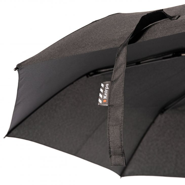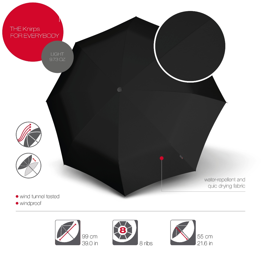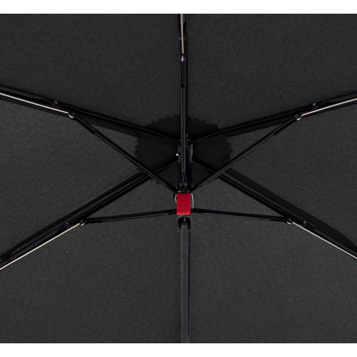 Due to the 3-piece steel pole, this model can be folded to a comfortable 24 cm and therefore easily fits in a bag or backpack. The umbrella is manufactured in well-known Knirps quality and has been tested in a wind tunnel at wind speeds of up to 80 km/h. The stability is additionally increased by the 8 struts in the canopy, as the struts distribute the wind load optimally. The frame is kept in modern black and the canopy is available in different colors.