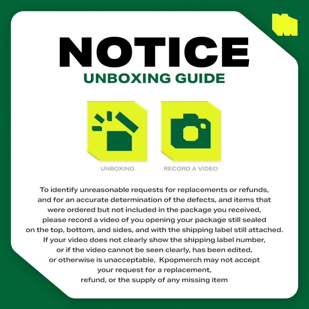 ✔ชี้แจ้งกรณีมีคำขอที่ไม่สมเหตุสมผลสำหรับการเปลี่ยนหรือคืนเงิน และเพื่อการพิจารณาข้อบกพร่องและสินค้าที่สั่งซื้อแต่ไม่ได้รวมอยู่ในแพ็คเกจที่คุณได้รับอย่างแม่นยำ โปรดบันทึกวิดีโอของคุณขณะเปิดแพ็คเกจโดยยังปิดผนึกที่ด้านบน ด้านล่าง และด้านข้าง และยังคงติดฉลากการจัดส่งไว้ หากวิดีโอของคุณไม่แสดงหมายเลขฉลากการจัดส่งอย่างชัดเจน หรือหากไม่สามารถดูวิดีโอได้อย่างชัดเจน มีการตัดต่อวิดีโอ หรือไม่สามารถยืนยันได้ด้วยวิธีอื่น Kpopmerch อาจไม่ยอมรับคำขอของคุณสำหรับการเปลี่ยน คืนเงิน หรือจัดหาสินค้าที่ขาดหายไป