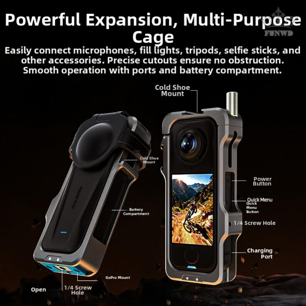 * โครงสร้าง: ผลิตจากอลูมิเนียมคุณภาพสูงกรงโลหะนี้ให้การปกป้องที่แข็งแกร่งสำหรับ INSTA360 X4 Air สามารถทนต่อความแข็งแกร่งของการใช้งานกลางแจ้งในขณะที่ยังคงรูปลักษณ์ที่สวยงาม