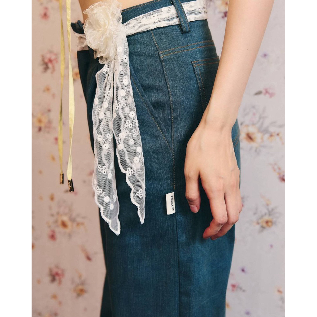 Swan shop กางเกงยีนส์สีขาวขายาวทรงกระบอก แถบเอวลูกไม้ คุณภ…