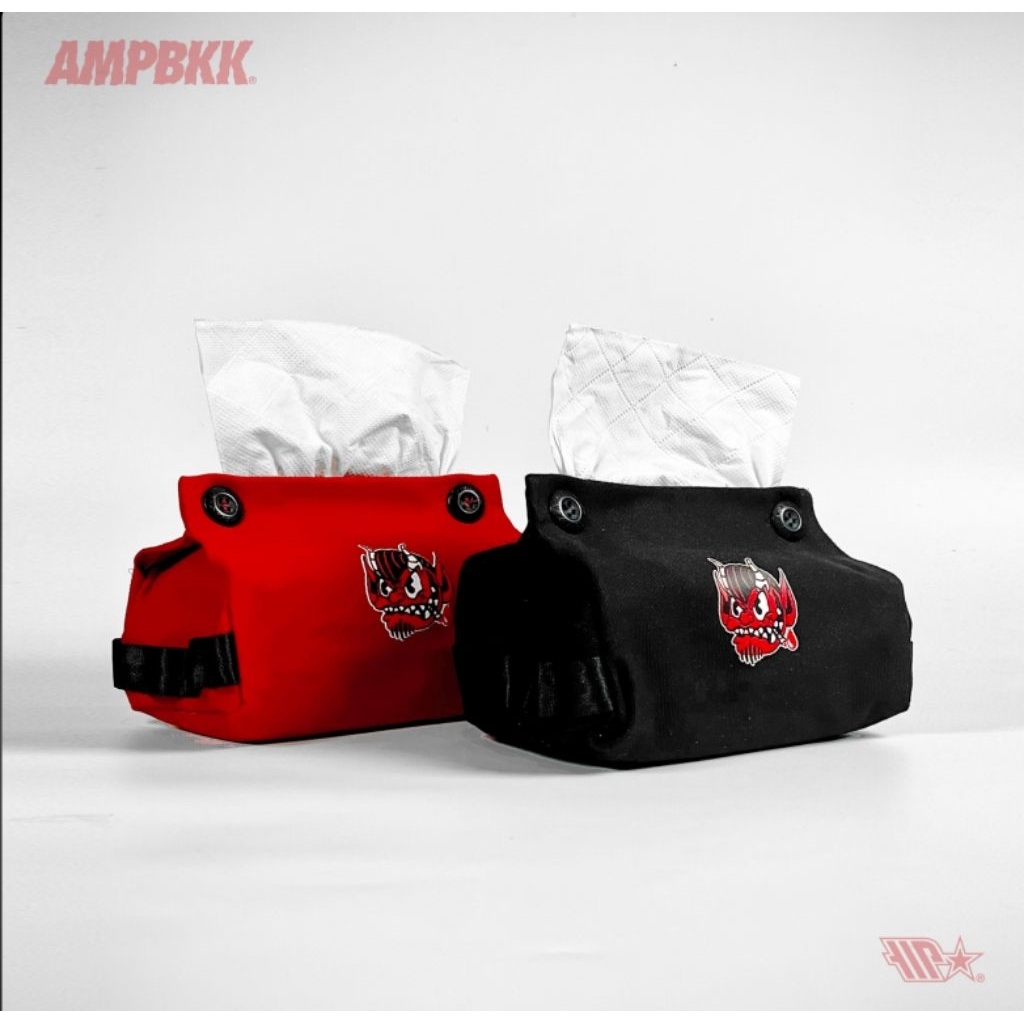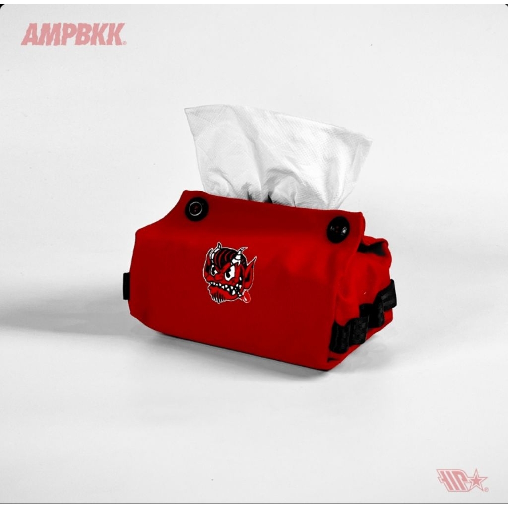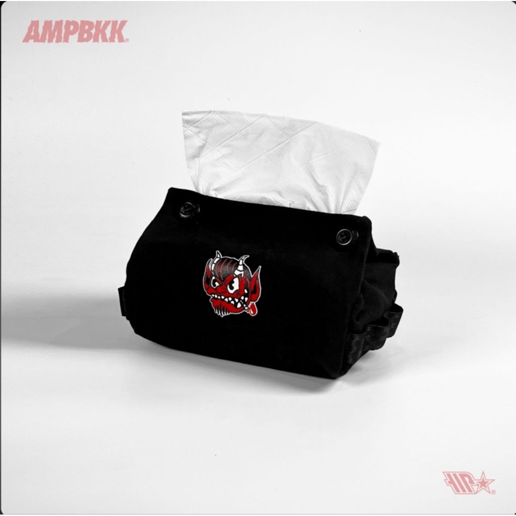 A.M.P. Canvas Tissue Holder, screened logo on front and back. Carabiner loop on both side. Suitable for camping or use it at home.