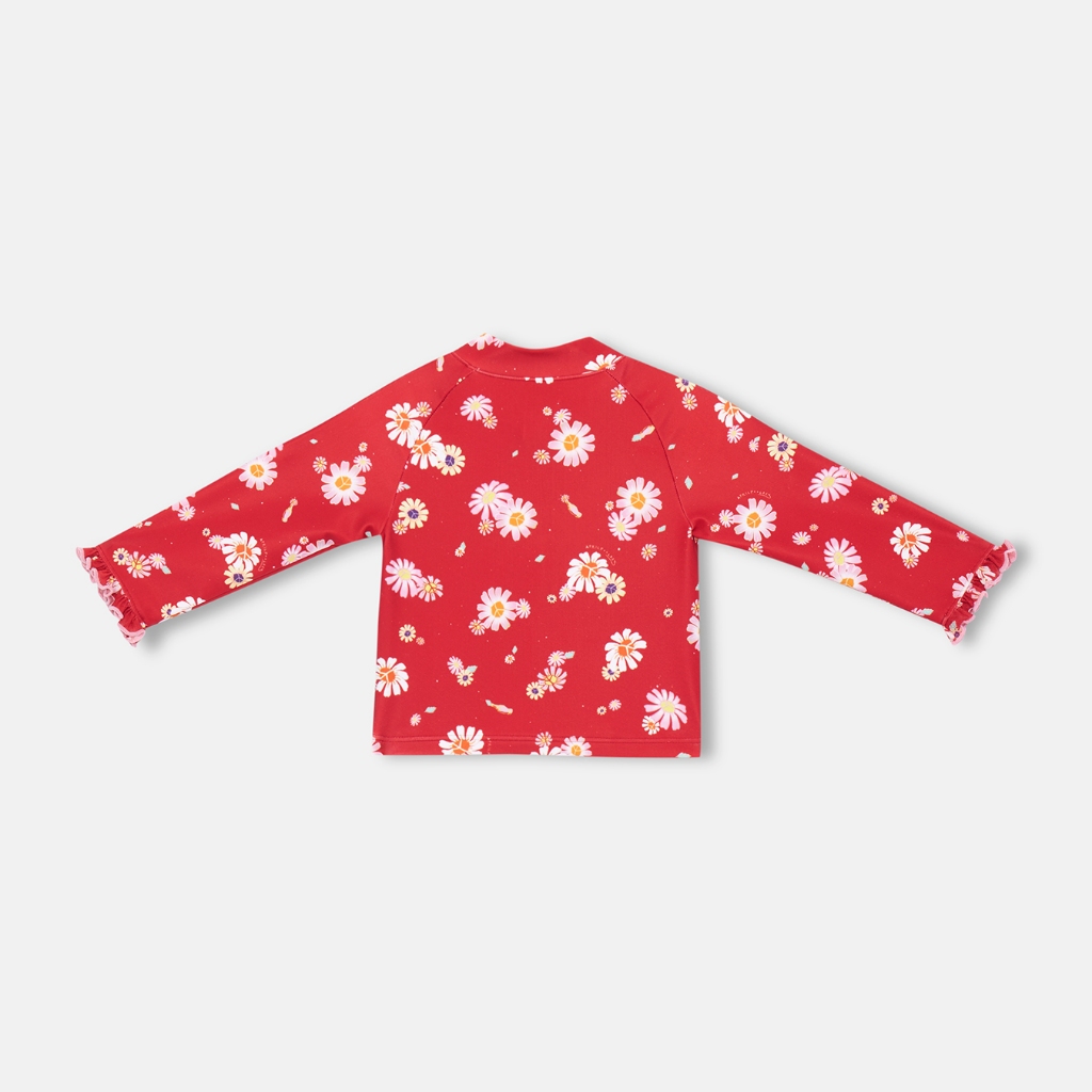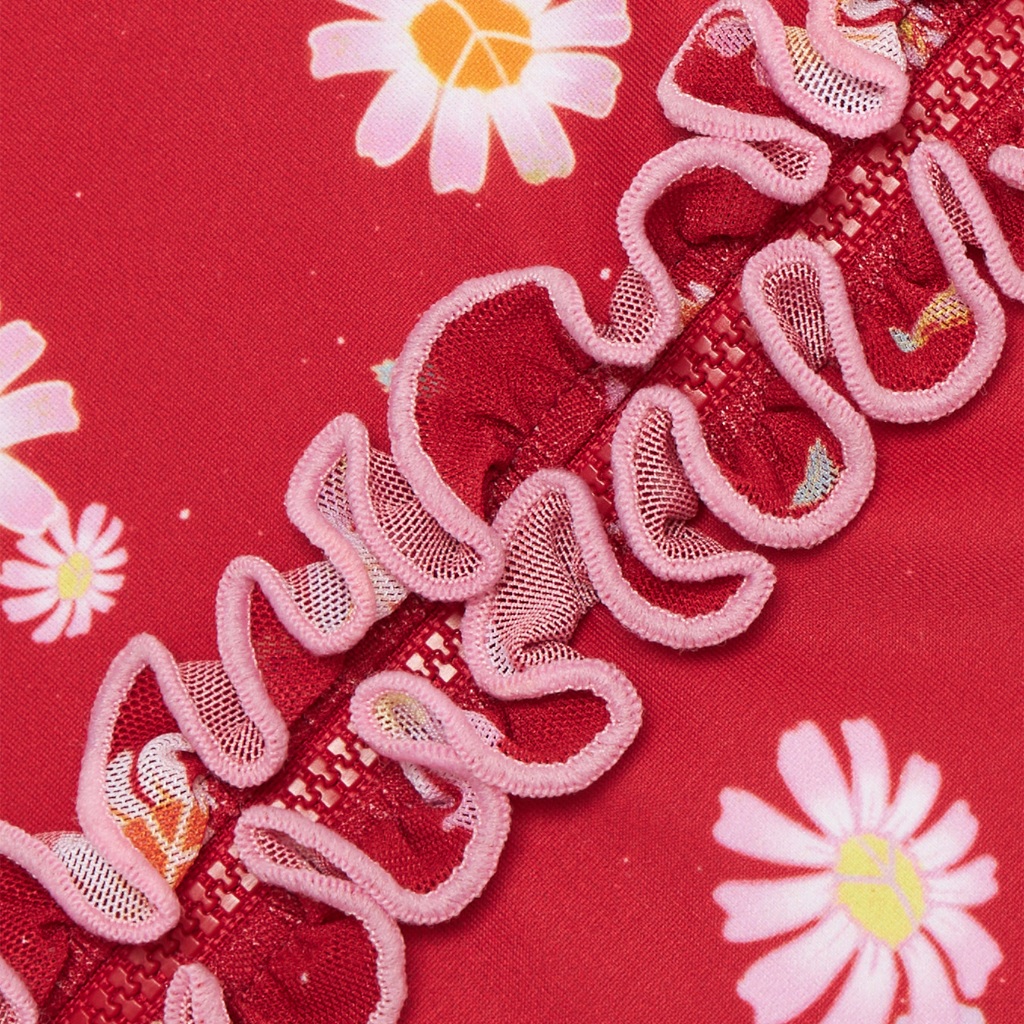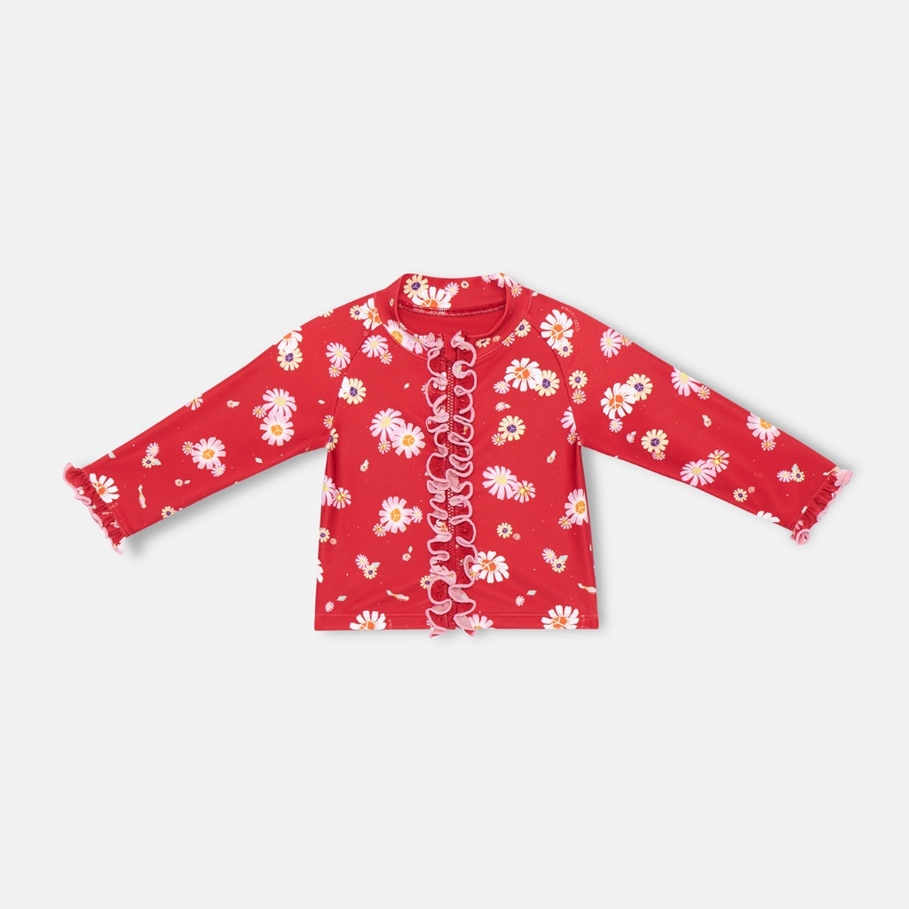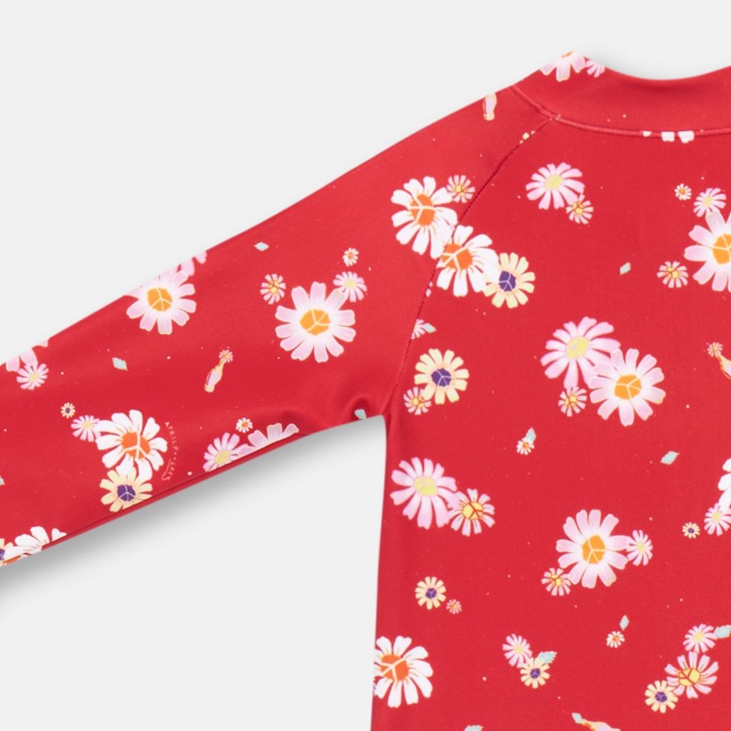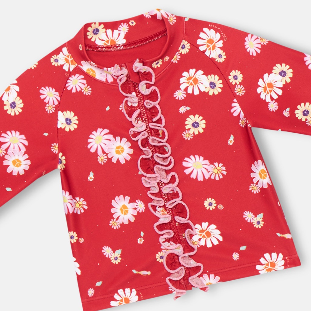 The Kids Molly Rashguard in Red Daisies brings the playful charm of Aprilpoolday’s Daisies Drop into a versatile, jacket-inspired layer. Designed with a straight cropped silhouette and full-length raglan sleeves, it features the brand’s hand-drawn daisies print and a soft ruffle-trimmed zip front. Easy to wear in and out of the water, it pairs perfectly with the Kids Julia Two Piece for sun-filled days.