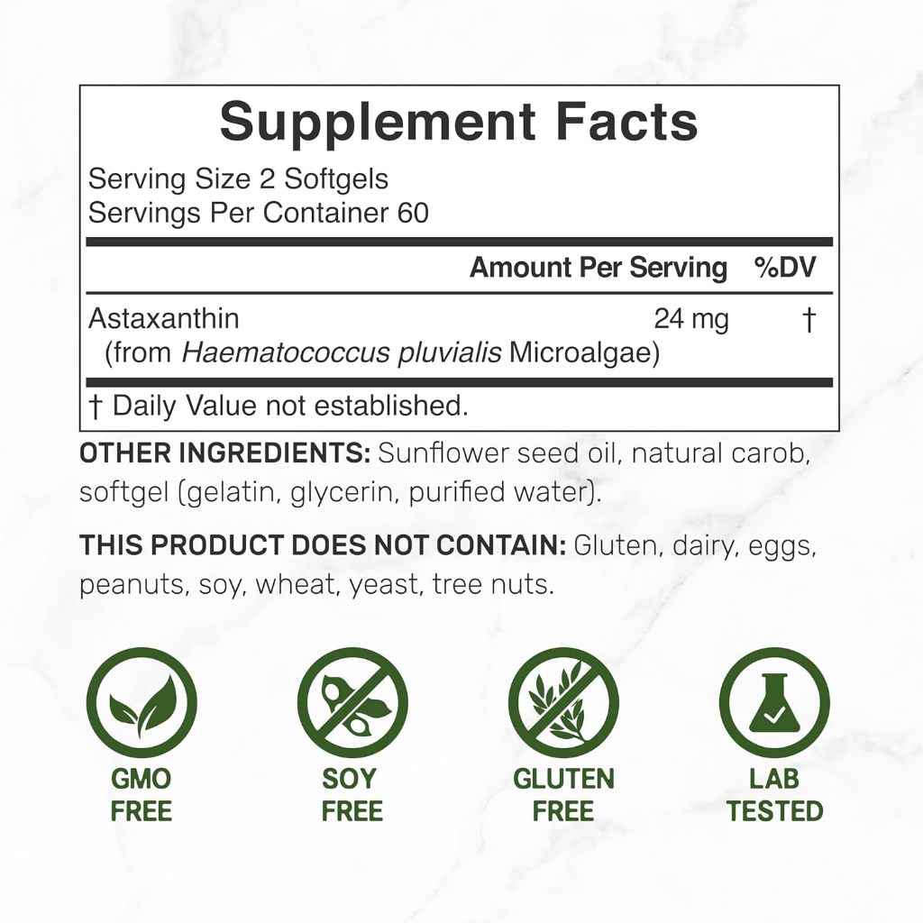 Dosage & Servings – A potent formula that offers 120 softgels per bottle and provides 24mg of pure astaxanthin per serving. This allows for up to a 2-month supply.