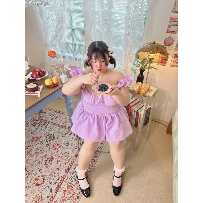 ชุดเซ็ทแขนเปิดไหล่แขนบอลลูนนตกแต่งโบว์สีขาวน่ารักมาก