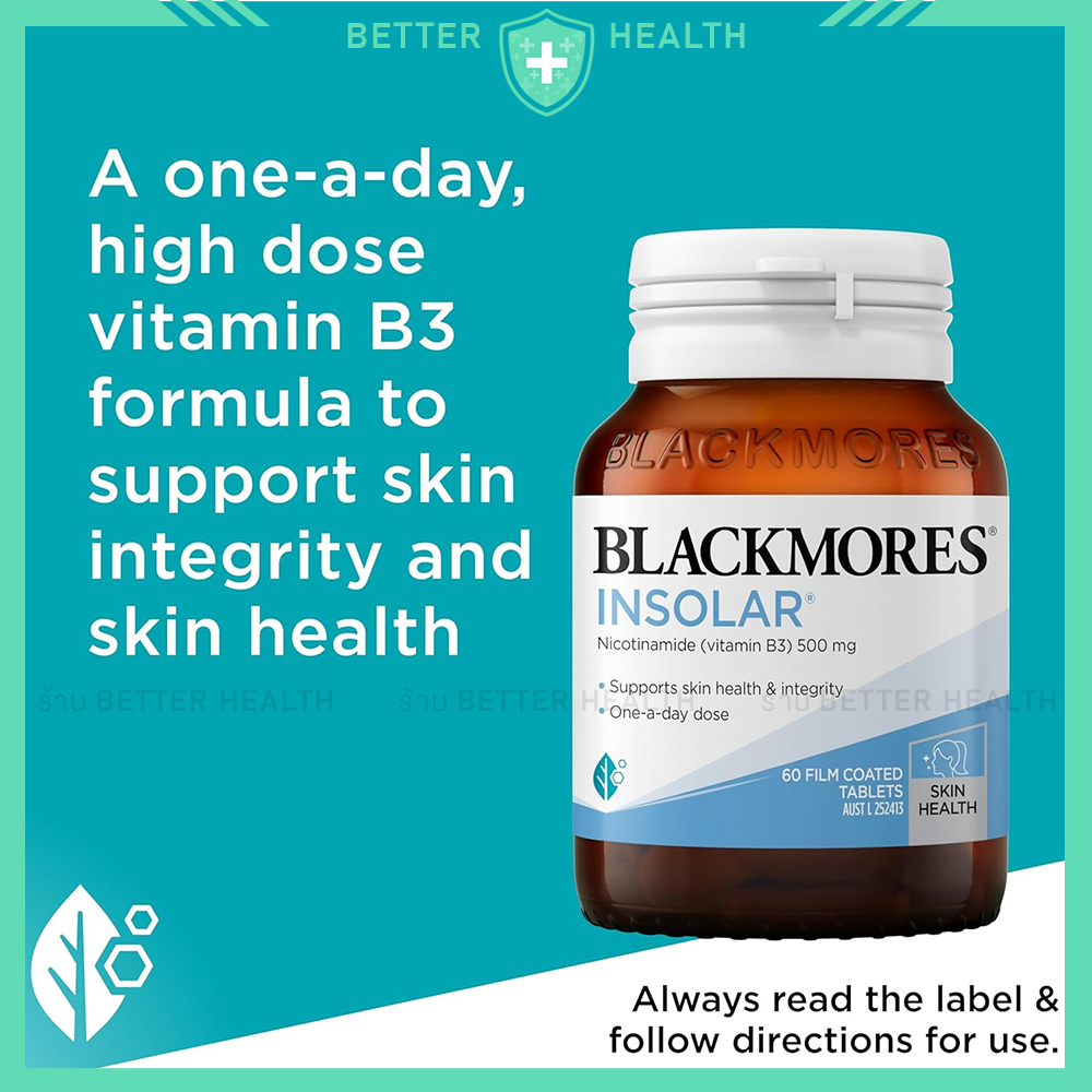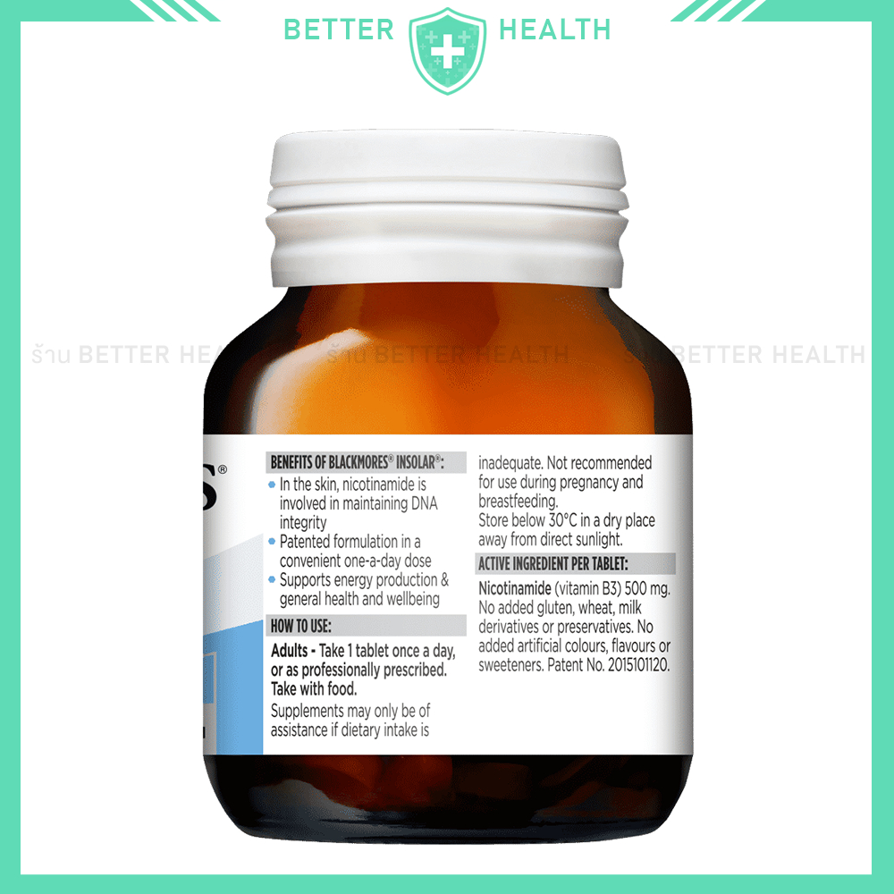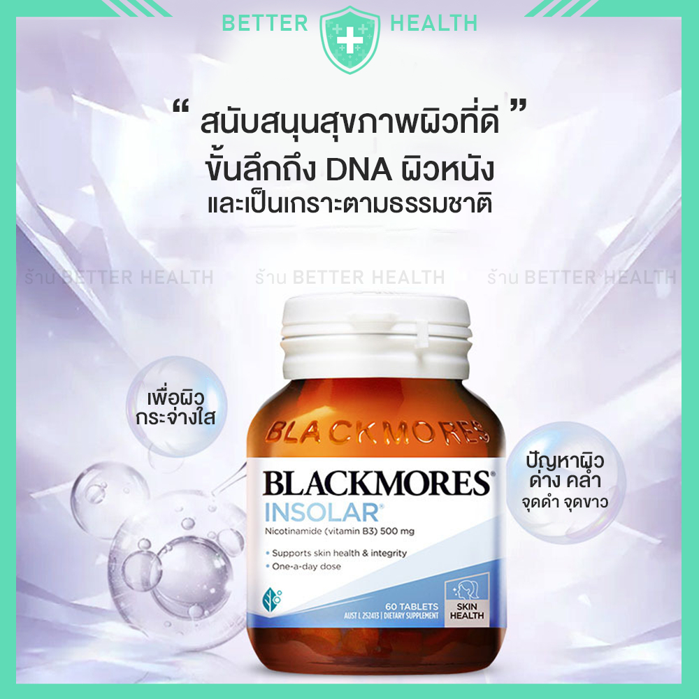 BLACKMORES INSOLAR วิตามินสูตรเข้มข้น(นิโคตินาไมด์) เพื่อการดูแลสุขภาพผิวอย่างลึกล้ำถึงระดับชั้น DNA ผิว ฟื้นดูแลการภายในของจริง ปัญหาริ้วรอย จุดขาว จุดดำ ด่าง คล้ำ หมอง แห้ง กร้าว หรือหยาบตึง ตัววิตามินจะค่อยๆทำการปรับปรุงซ่อมแซมอย่างเนื่อง ทีละเล็กๆน้อยๆ (แนะนำทานต่อเนื่อง 3 เดือน) และยังเป็นเกราะตามวิถีธรรมชาติ จากมลภาวะ แสงแดด และลดความเสื่อมของเซลล์ที่มาตามวันเวลา หรือการใช้ชีวิต การทำงาน และสนับสนุนความสว่างใสอย่างเป็นธรรมชาติ ให้ดูเปร่ง ดูปลั่ง สุขภาพดี มีความมั่นใจ