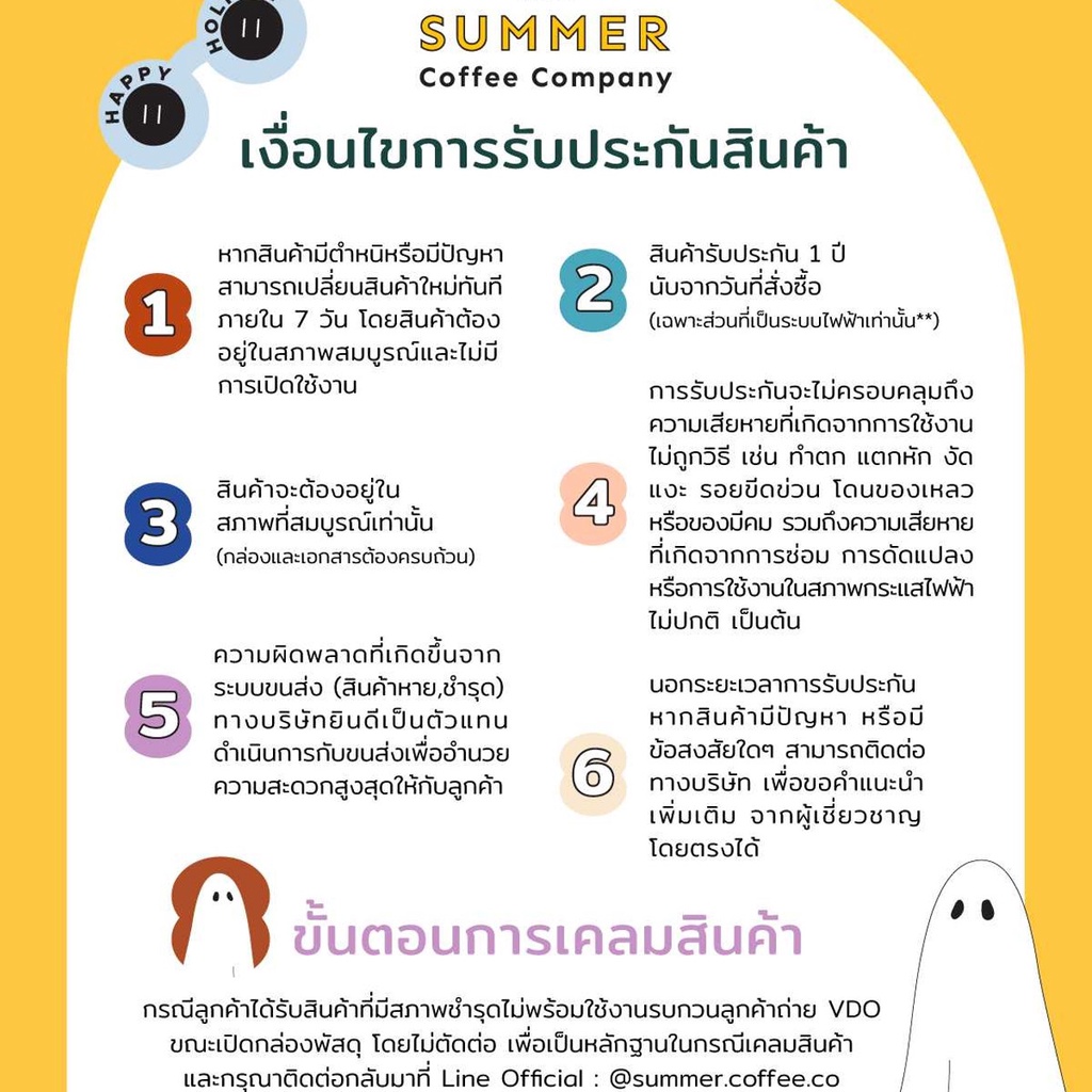 กรณีลูกค้าได้รับสินค้าที่มีสภาพชำรุดไม่พร้อมใช้งาน กรุณาติดต่อกลับมาที่ Line Officail : @summer.coffee.co เพื่อแจ้งบริษัทและขอเปลี่ยนสินค้าภายใน 3 วัน