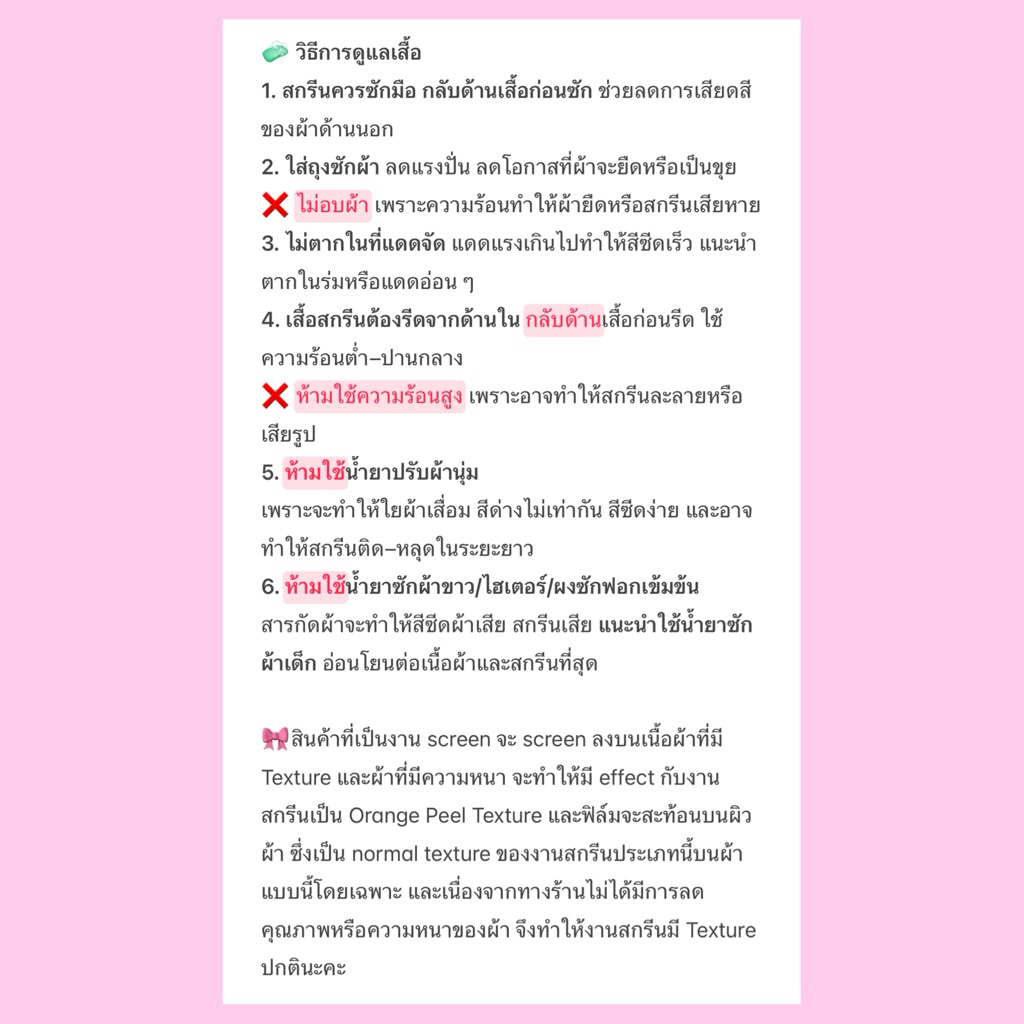 🎀สินค้าที่เป็นงาน screen จะ screen ลงบนเนื้อผ้าที่มี Texture และผ้าที่มีความหนา จะทำให้มี effect กับงานสกรีนเป็น Orange Peel Texture และฟิล์มจะสะท้อนบนผิวผ้า ซึ่งเป็น normal texture ของงานสกรีนประเภทนี้บนผ้าแบบนี้โดยเฉพาะ และเนื่องจากทางร้านไม่ได้มีการลดคุณภาพหรือความหนาของผ้า จึงทำให้งานสกรีนมี Texture ปกตินะคะ
