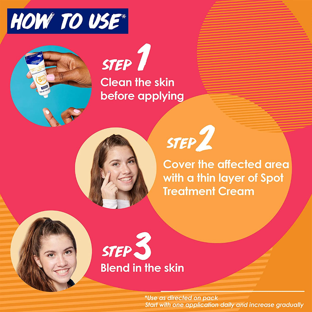 Clearasil Stubborn 5-in-1 spot treatment cream is your one-stop solution to target the 5 stubborn signs of acne and give you visibly clearer skin. It helps in fighting blocked pores, pimple size, excess oil, acne marks and blackheads for clear skin. The acne treatment cream comes with Benzoyl Peroxide Acne Medication that clears existing pimples and helps prevent new ones from forming. This Clearasil cream provides deep cleansing by tackling pimples above and below the skin surface. It gives you maximum strength medication for 24 hours by penetrating your pores; so you can live a carefree life today and tomorrow. The cream is designed to use for acne.How To Use: Cover the entire affected area with a thin layer of Clearasil Stubborn Acne Control 5-in-1 Spot Treatment Cream, start with one application daily, then gradually increase to two or three times daily if needed or as directed by the doctor.Warning: Do not use if you have very sensitive skin or are sensitive to benzoyl peroxide. Avoid unnecessary sun exposure and use sunscreen, avoid contact with eyes, lips, and mouth.Proud Partner of Stomp Out Bullying, the leading national non-profit organization in the country that raises awareness about bullying and provides resources for students, teachers and parents to help counter all types of harassment