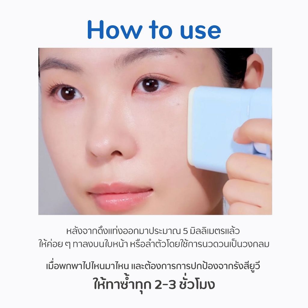 ● สามารถทาซ้ำได้ทุก 2–3 ชั่วโมง เมื่อต้องการเพิ่มประสิทธิภาพการปกป้องผิวจากแสงแดด