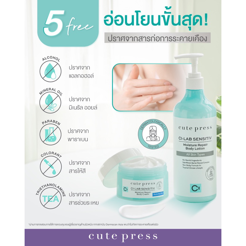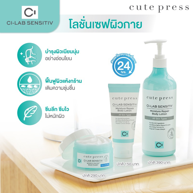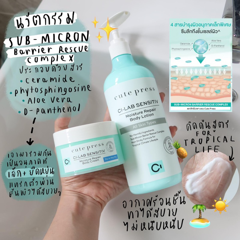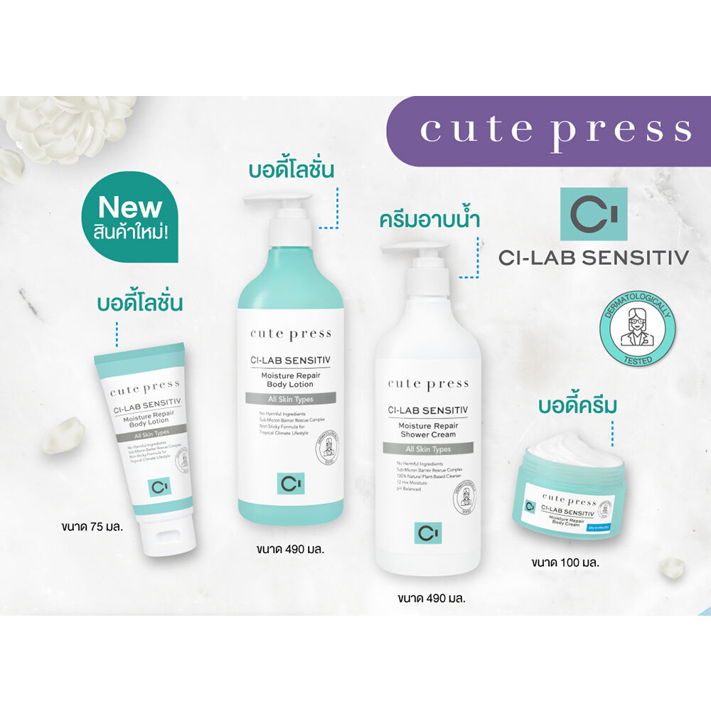 ครีมบำรุงผิวกาย เพื่อผิวกายที่ช่วยฟื้นฟูผิวแห้งกร้าน เสริม Skin Barrier หรือ หรือเกราะป้องกันผิวหนังที่อ่อนแอ ให้กลับมาแข็งแรง ใช้ได้แม้ผิวบอบบางแพ้ง่าย ที่มีส่วนผสมขั้นสุดพิเศษกว่า ด้วยเซราไมด์ที่ออกแบบมาเฉพาะของคิวท์เพรส กับครีมบำรุงผิวกาย Cute Press Ci-Lab Sensitiv Moisture Repair Body Cream