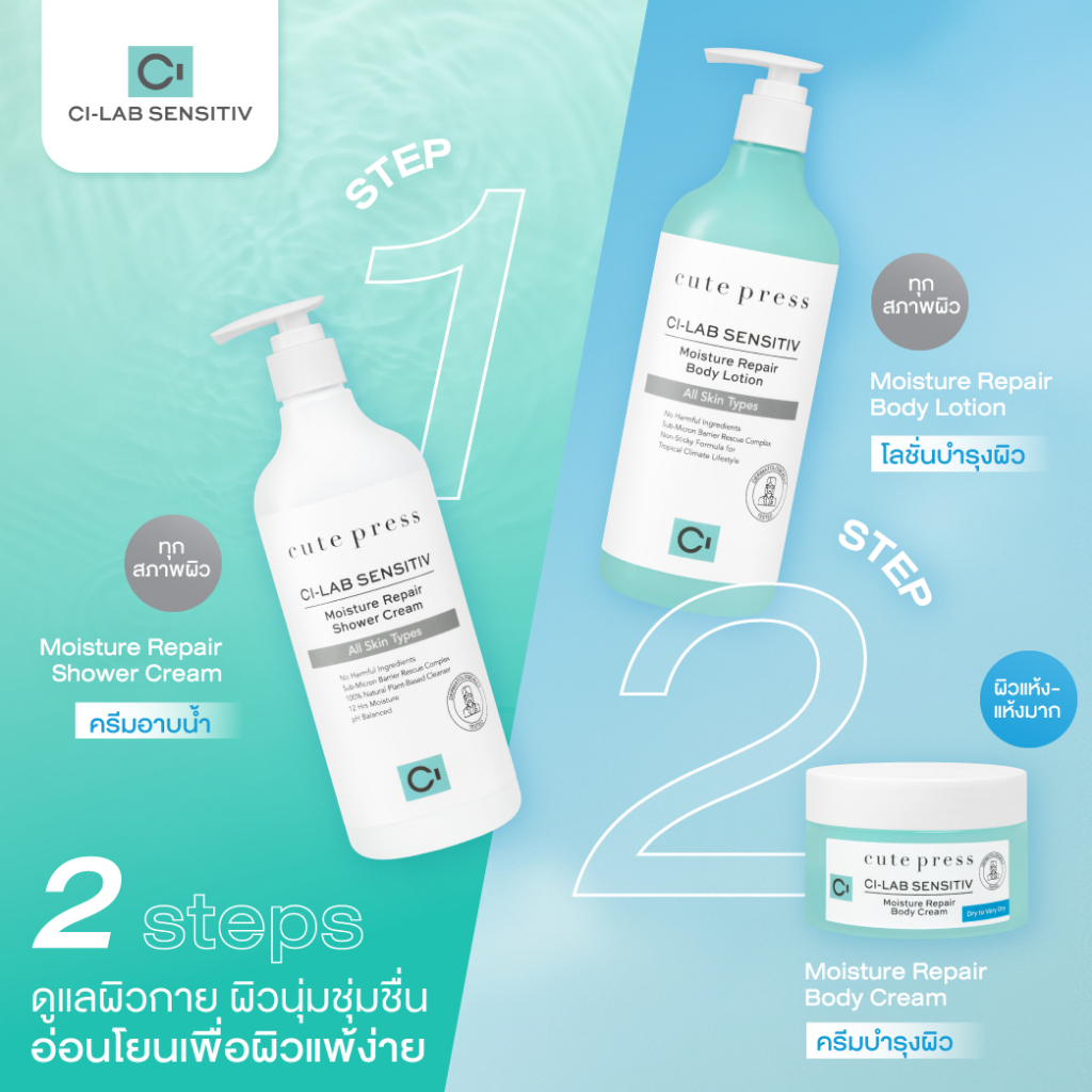 Steps การดูแลผิวกาย ที่ออกแบบและพัฒนามาให้ตอบโจทย์กับคนไทยในเขตร้อนชื้น ช่วยซ่อมแซมผิวอ่อนแอ เสริมเกราะป้องกันผิวหนังให้แข็งแรง ด้วยนวัตกรรม Sub-Micron Barrier Rescue Complex เป็นเอกสิทธิ์เฉพาะของ Cute Press ที่รวบรวมคุณสมบัติพิเศษเหนือกว่า ที่แปรสภาพสารสกัด 4 ชนิดประกอบไปด้วย เซราไมด์ ที่เป็นสารสกัดหลักที่เด่นเรื่องช่วยให้ผิวแข็งแรงขึ้น นอกจากนี้ยังเสริมกำลังด้วยสารสกัดที่มาช่วยเสริมความเก่ง Phytosphingosine, อโล เวร่า และ D-Panthenol รวมผสานให้เป็นขนาด sub-micron อนุภาคเล็กพิเศษ เพื่อให้สารสกัดที่ช่วยบำรุงอย่างเห็นผลจริง ซึมตรงเข้าสู่ผิวได้ลึกถึงชั้นผิว ซึมซาบไว ไม่เหนียวเหนอะหนะ และเข้าไปเสริมชั้นผิวที่เกิดปัญหาผิวได้อย่างเต็มประสิทธิภาพ และพัฒนาให้ตอบโจทย์เข้ากับไลฟ์สไตล์คนไทยเขตร้อนชื้นได้ดีที่สุด